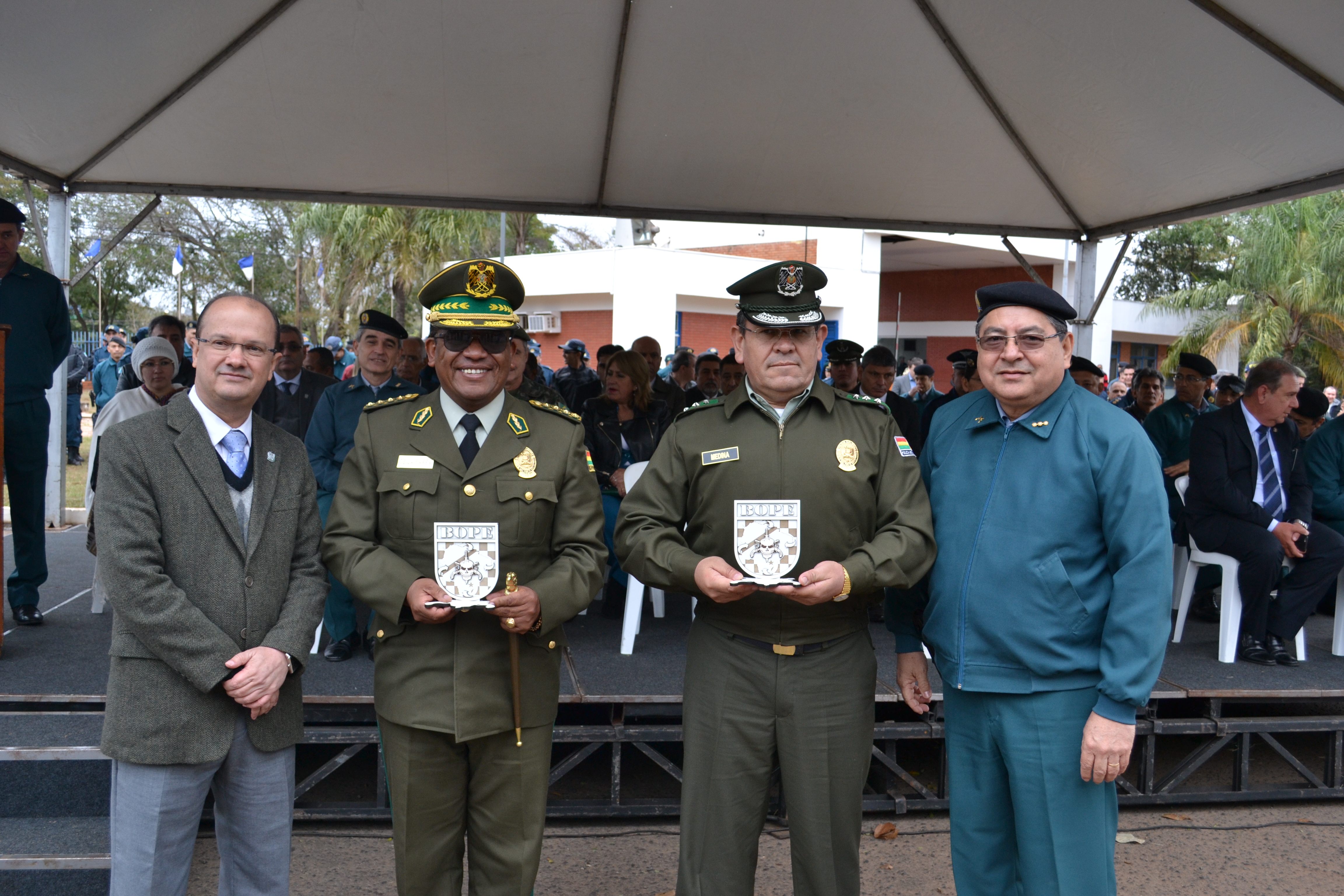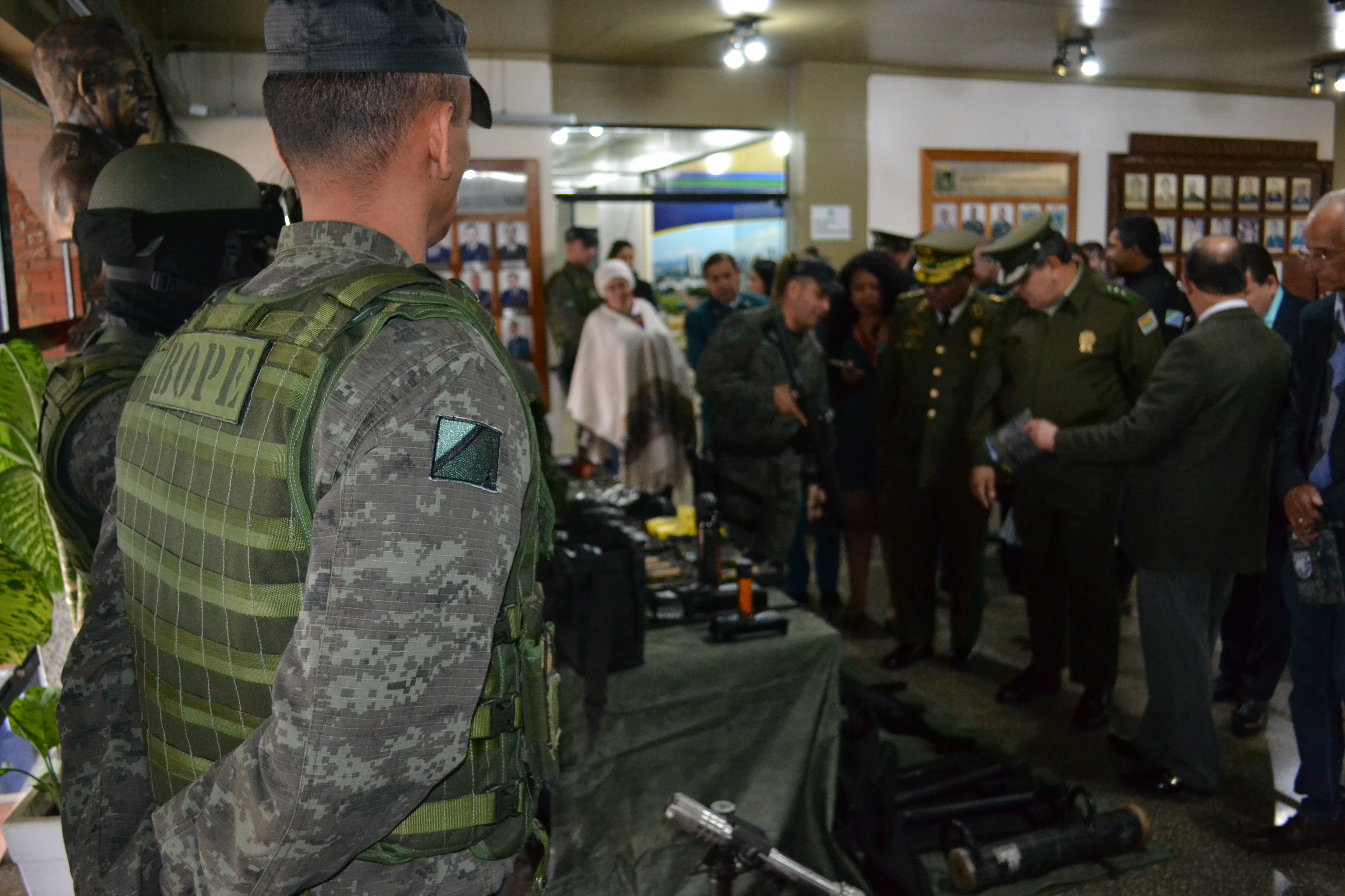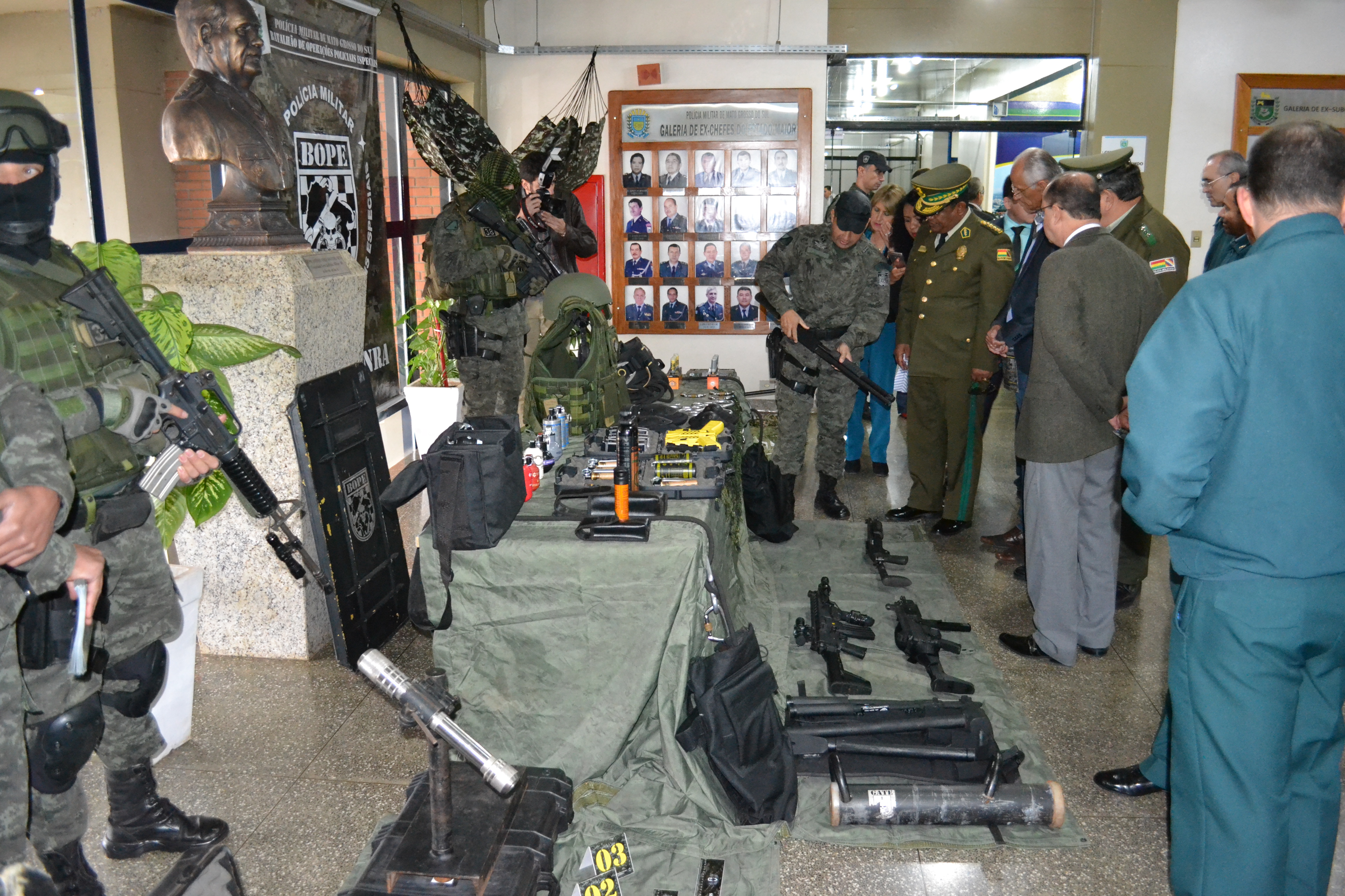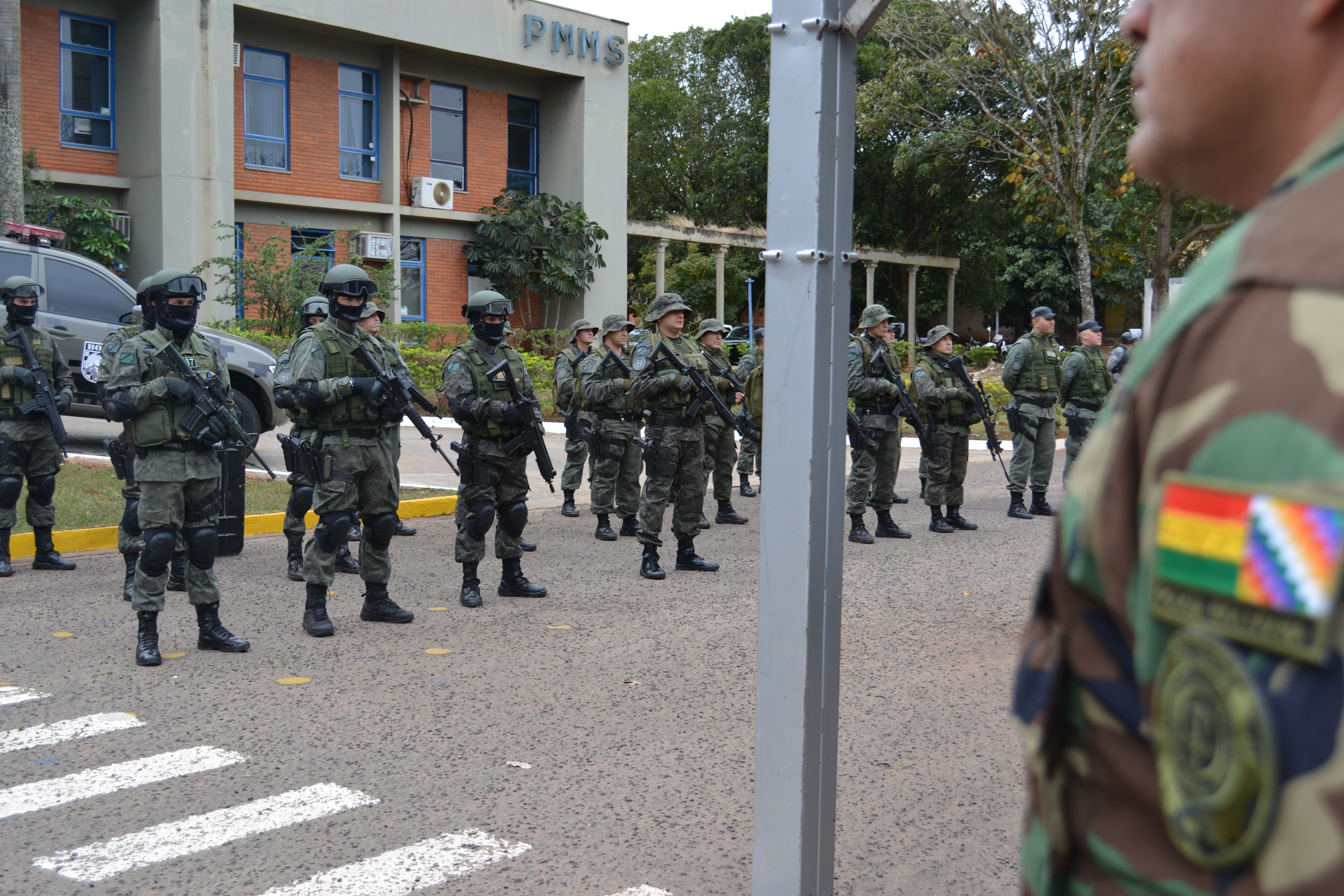 Campo Grande (MS) –A Polícia Militar do Estado de Mato Grosso do Sul através do Batalhão de Operações Especiais (BOPE) realizou hoje (17), às 14h, no quartel do Comando Geral da PMMS, a abertura oficial do Estágio de Patrulha em Ambiente Rural, que foi oferecido à Polícia Nacional da Bolívia. A solenidade contou com a presença do secretário de Estado de Justiça e Segurança Pública, José Carlos Barbosa, ministro de Governo da Bolívia, Carlos Romero Bonifaz, do Comandante-Geral da PMMS, Coronel Waldir Ribeiro Acosta, o Comandante-Geral da Corporação Boliviana, Abel Galo de La Barra Cáceres, do diretor do Departamento de Força Especial de Luta Contra o Crime de Santa Cruz da Polícia Boliviana, Gonzalo Felipe Medina Sánchez, entre outras autoridades, civis e militares.