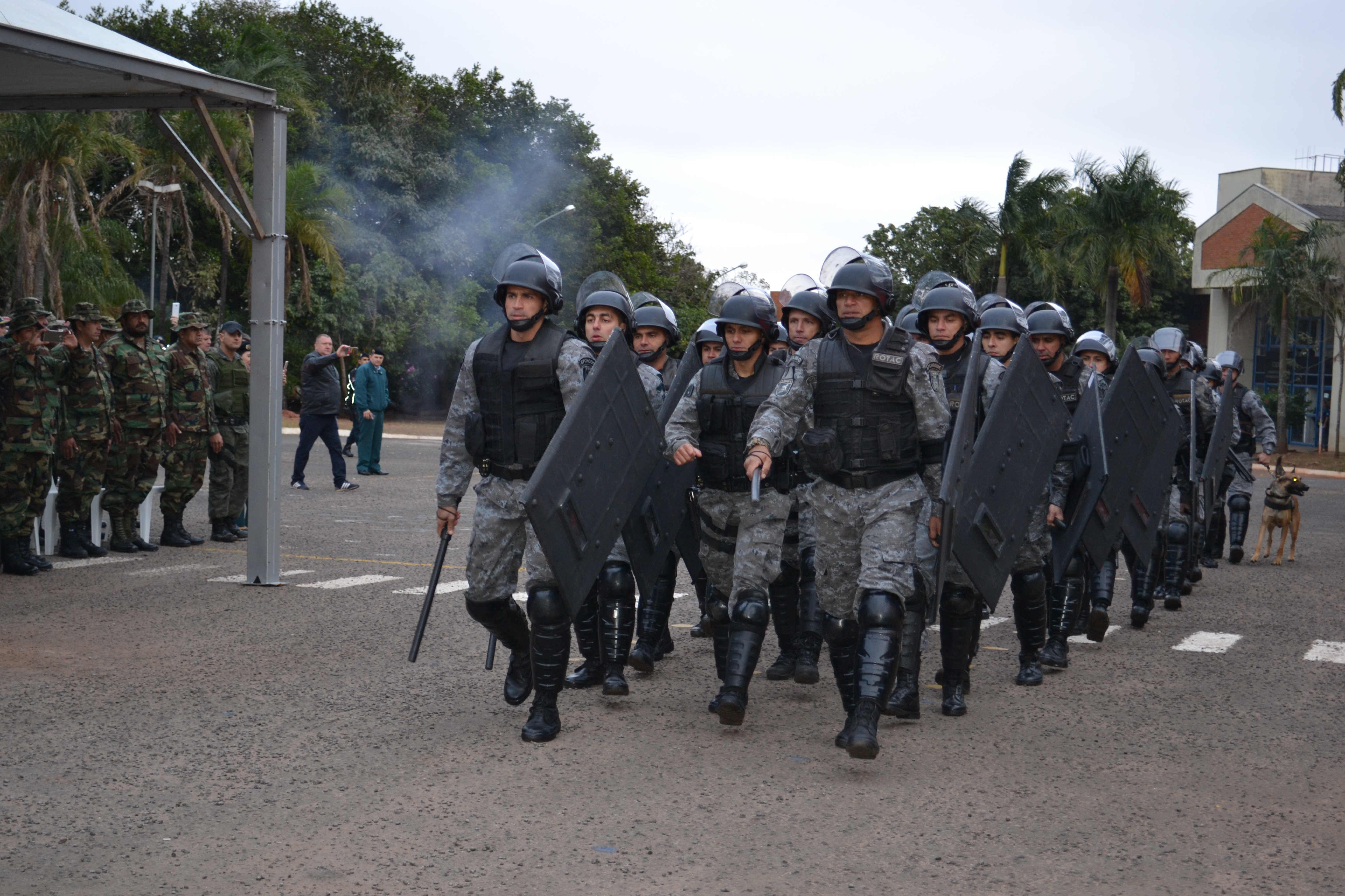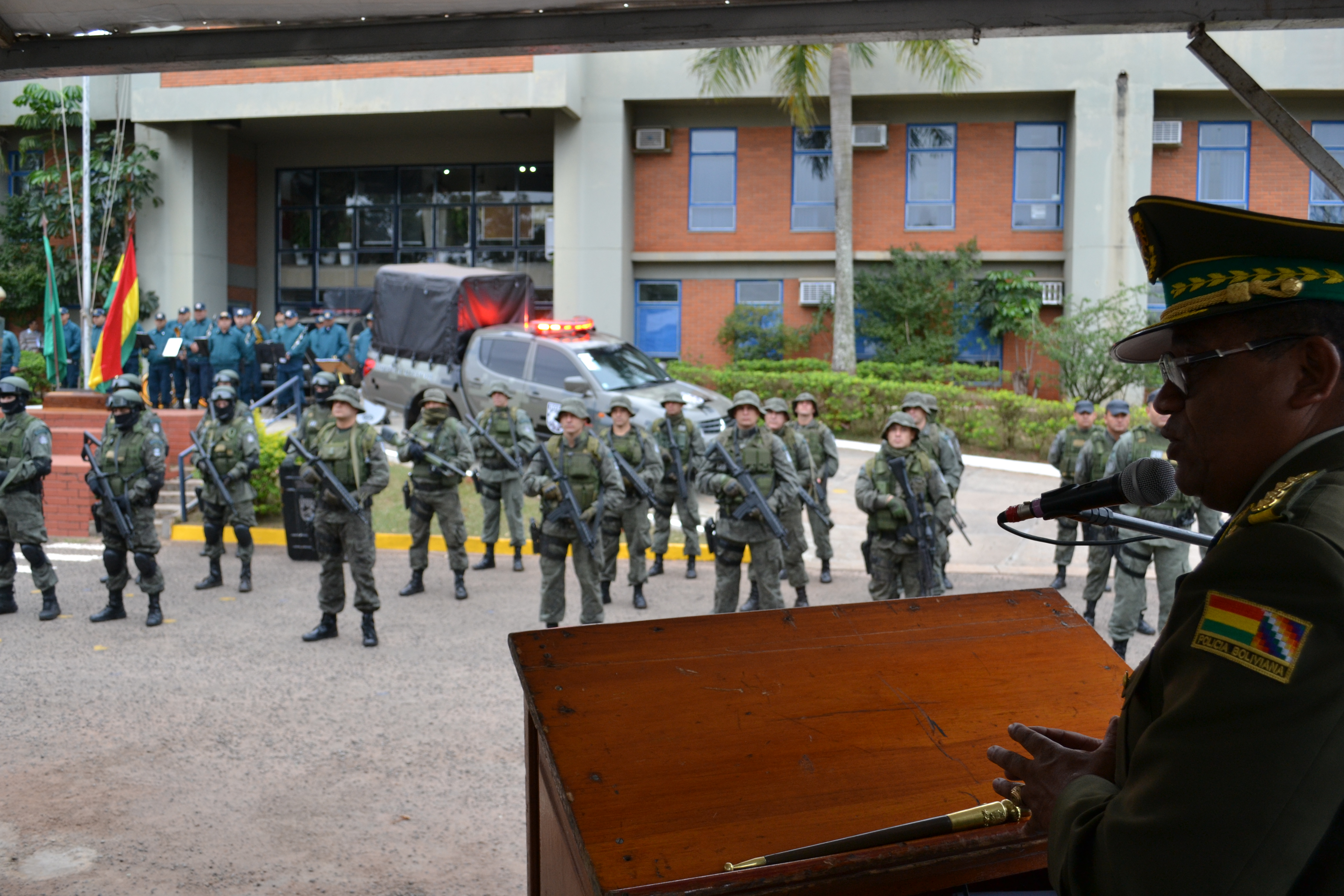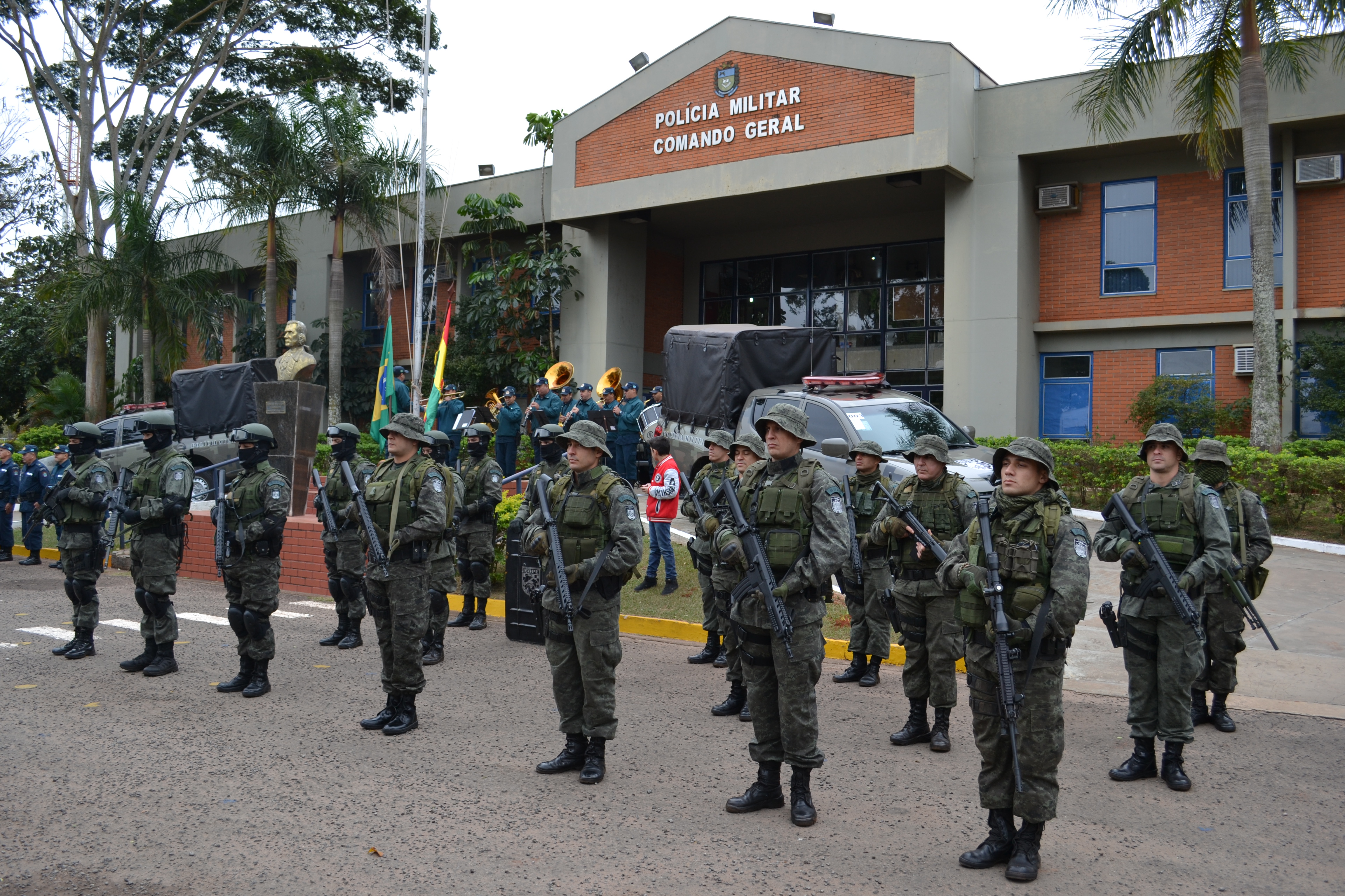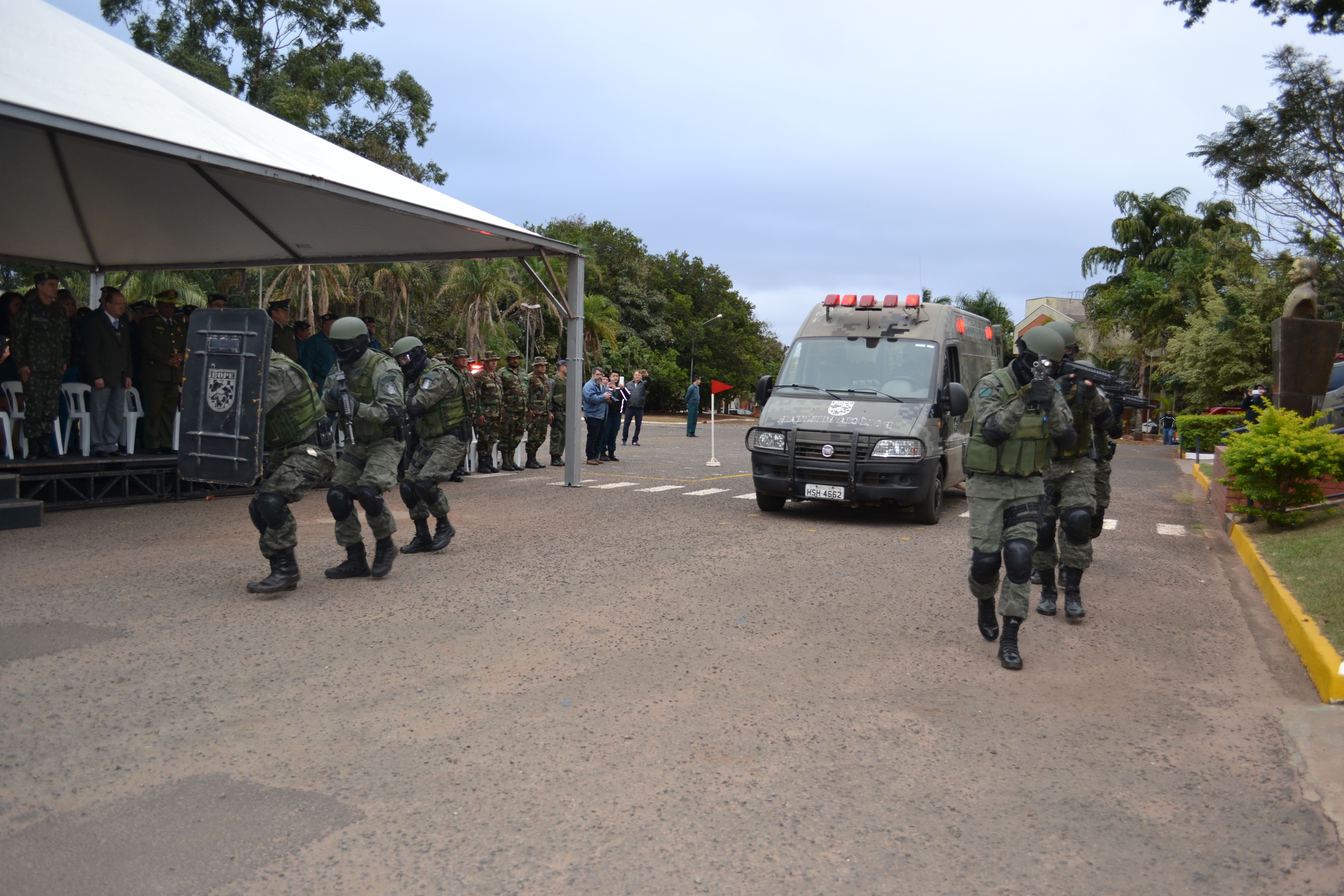 Campo Grande (MS) –A Polícia Militar do Estado de Mato Grosso do Sul através do Batalhão de Operações Especiais (BOPE) realizou hoje (17), às 14h, no quartel do Comando Geral da PMMS, a abertura oficial do Estágio de Patrulha em Ambiente Rural, que foi oferecido à Polícia Nacional da Bolívia. A solenidade contou com a presença do secretário de Estado de Justiça e Segurança Pública, José Carlos Barbosa, ministro de Governo da Bolívia, Carlos Romero Bonifaz, do Comandante-Geral da PMMS, Coronel Waldir Ribeiro Acosta, o Comandante-Geral da Corporação Boliviana, Abel Galo de La Barra Cáceres, do diretor do Departamento de Força Especial de Luta Contra o Crime de Santa Cruz da Polícia Boliviana, Gonzalo Felipe Medina Sánchez, entre outras autoridades, civis e militares.