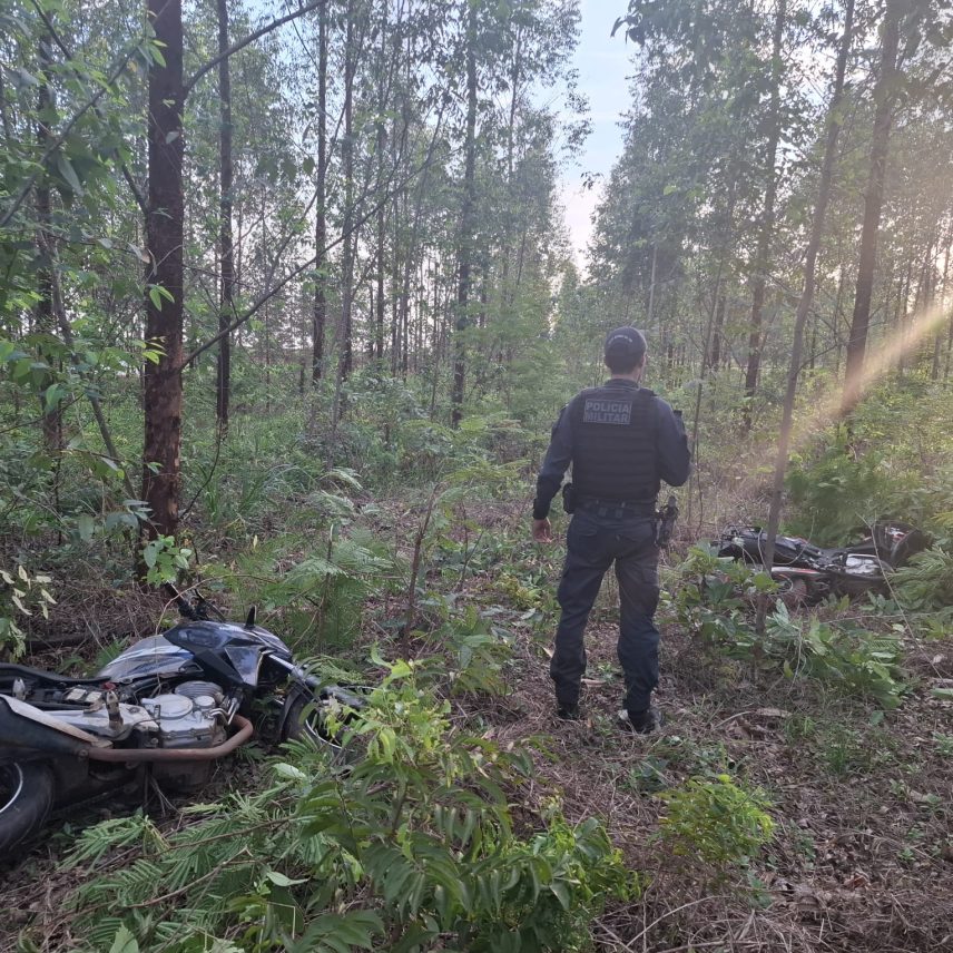 Neste sábado, por volta das 4h30, uma guarnição do Pelotão de Trânsito do 2º BPM foi acionada a verificar denuncia realizada ao 190 versando indivíduos em atitude de suspeição, onde durante diligências nas estradas e vegetação, quando no KM 11 da BR-262, a aproximadamente a 100 metros da via localizaram 2 motocicletas escondidas em meio à vegetação.