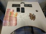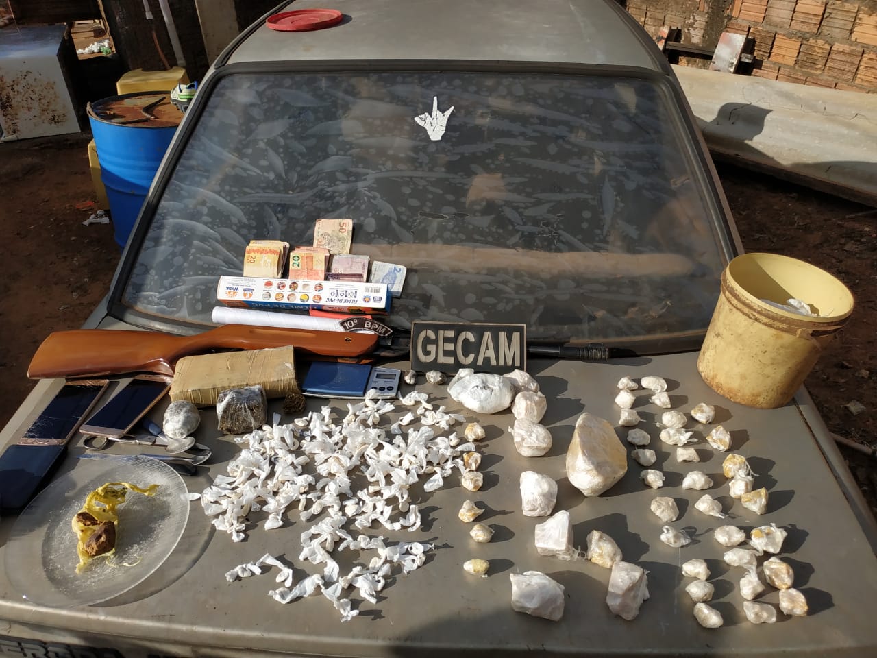 No primeiro endereço a esposa do autor de 27 anos, franqueou a entrada dos policiais, afirmando que nada de errado seria encontrado. Porém embaixo de um dos colchões, uma arma artesanal e a quantia de R$300,00 em notas de baixo valor foram encontrados, no armário da cozinha dentro de uma caixa de madeira os militares encontraram 21 papelotes de cocaína e 04 aparelhos celulares além de R$10,00 em moedas. Questionada sobre o material dentro de sua casa, a mulher de 25 anos afirmou que apenas o dinheiro era dela.
