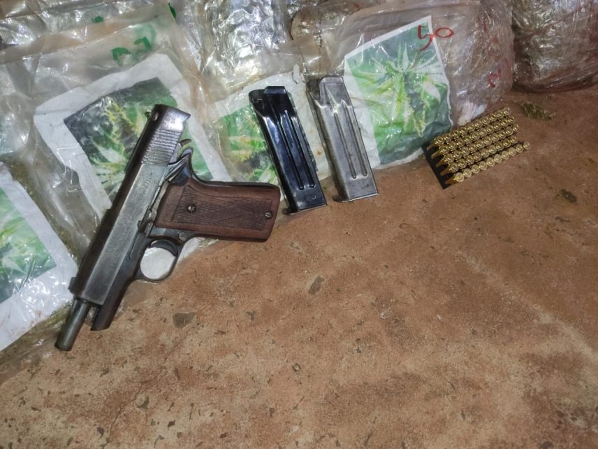 Durante vistoria no veículo foram encontrados diversos tabletes e invólucros de entorpecentes que somaram 252,6 kg de substância análoga à maconha, 23,3 kg de substância análoga à skunk e 0,4 kg de substância análoga à haxixe, além disso foi encontrada uma pistola cal. 9mm, carregada com 15 munições e outras 34 munições de mesmo calibre.