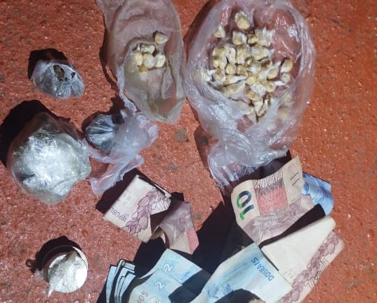 Uma busca no perímetro foi realizada e os policiais localizaram o objeto lançado pelo indivíduo, sendo um embrulho de plástico contendo sete porções de substância análoga ao crack. Já na área externa da residência, sobre uma mesa, foram localizadas mais três porções de substância análoga à maconha e a quantia de R$ 12,10 (doze reais e dez centavos). O homem de 21 anos informou ter vindo da cidade de São Paulo há aproximadamente dois meses e admitiu estar envolvido no tráfico de drogas como meio de subsistência e ainda indicou aos policiais, dentro da casa abandonada, um tijolo parcialmente quebrado que tinha em seu interior mais 49 porções de substância análoga ao crack, prontas para comercialização.