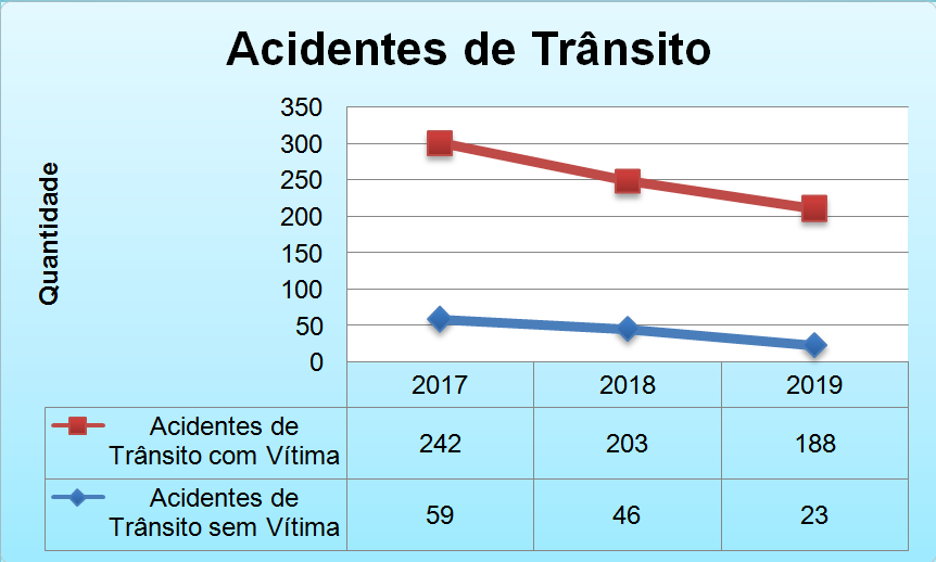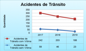 A redução nos índices é consequência da intensificação, por política de comando, nas abordagens a veículos, que no ano de 2019 totalizaram 10.305 abordagens, além de campanhas preventivas e “blitzes” de fiscalizações de trânsito. Os dados são ainda mais relevantes quando comparados com o ano de 2017, como se pode ver a diminuição dos índices no gráfico abaixo: