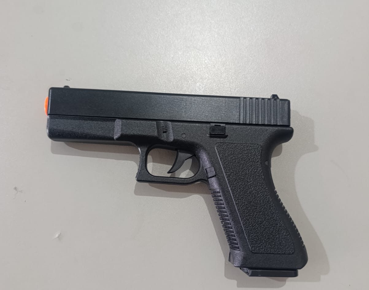 Objeto apreendido: Uma arma de airsoft (simulacro) de cor preta, modelo pistola.