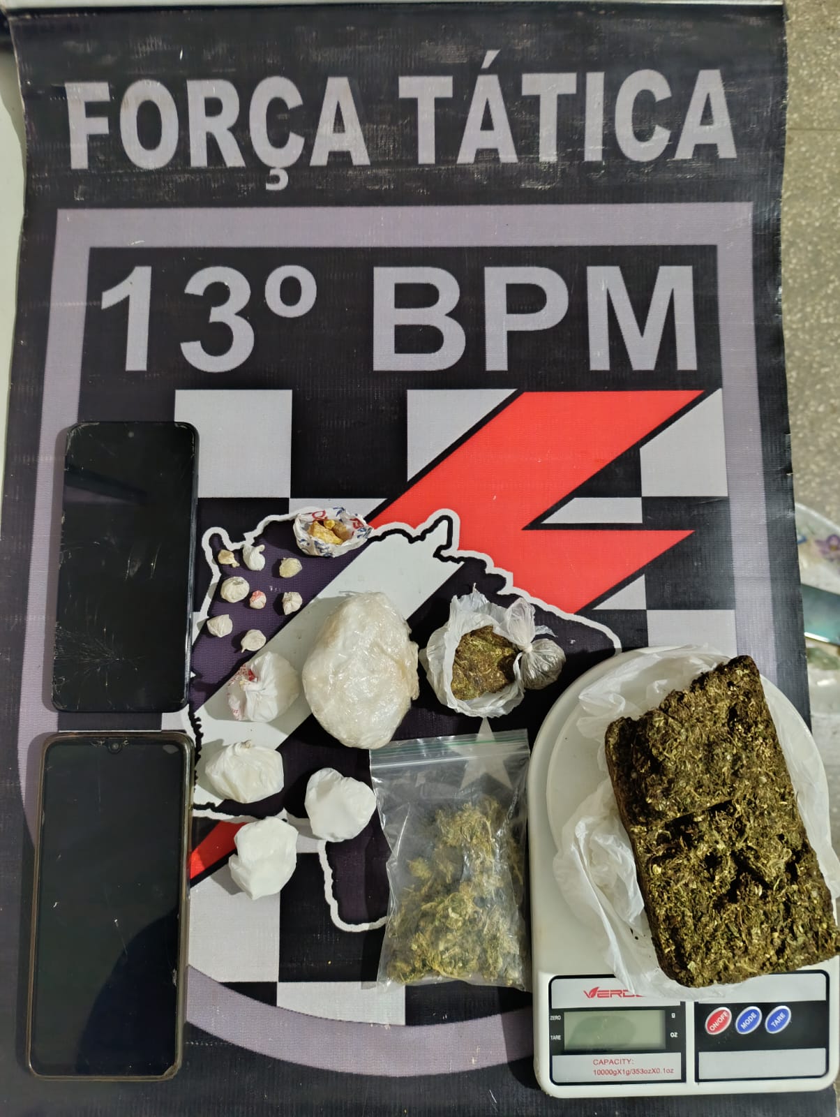 Na sequência, a equipe deslocou-se até o local denunciado, onde encontrou a motocicleta estacionada e três indivíduos no interior do imóvel. Durante a abordagem, foi localizada uma porção de maconha próxima a um dos suspeitos. Em buscas posteriores, os policiais encontraram no interior da residência:
