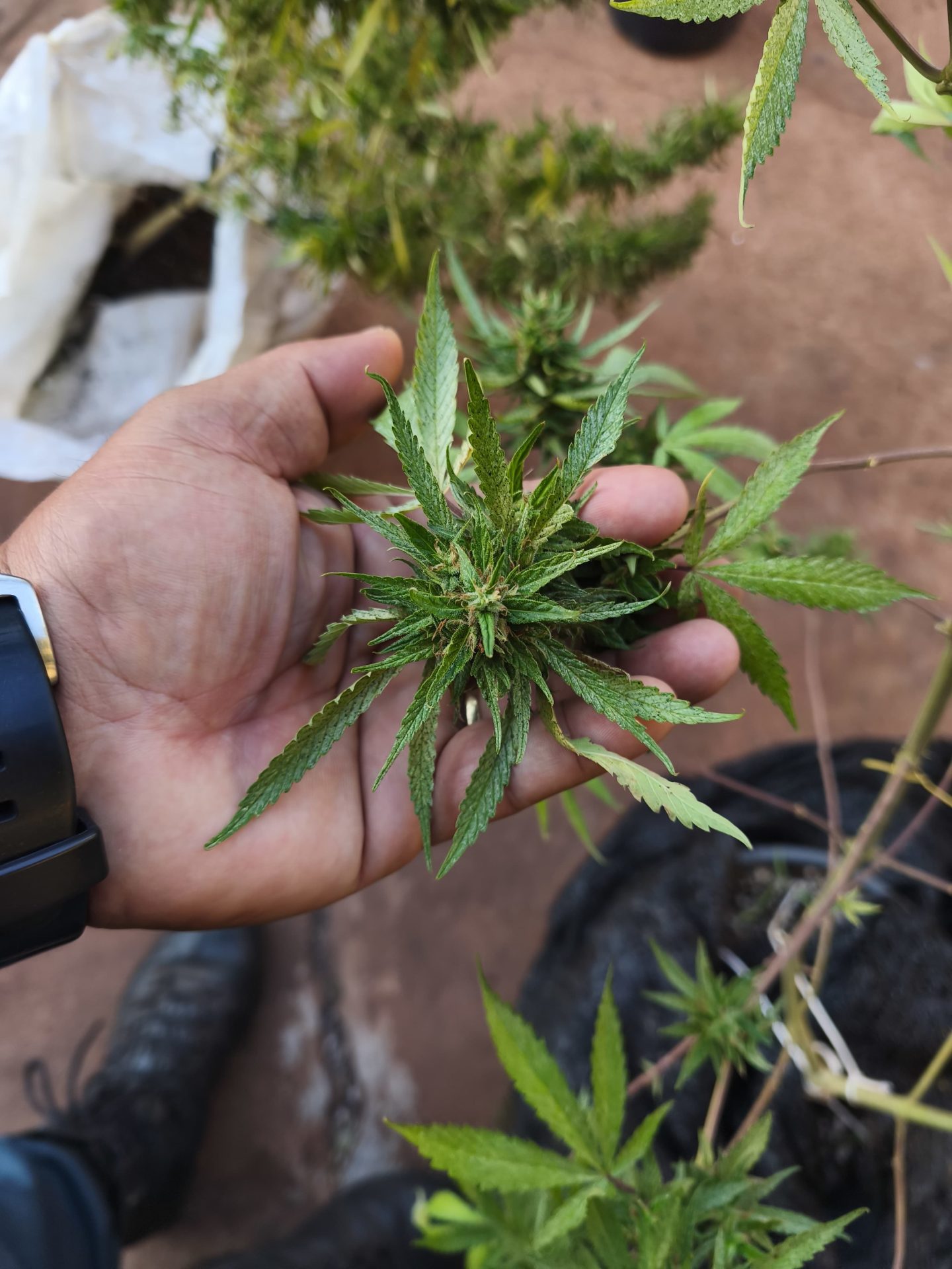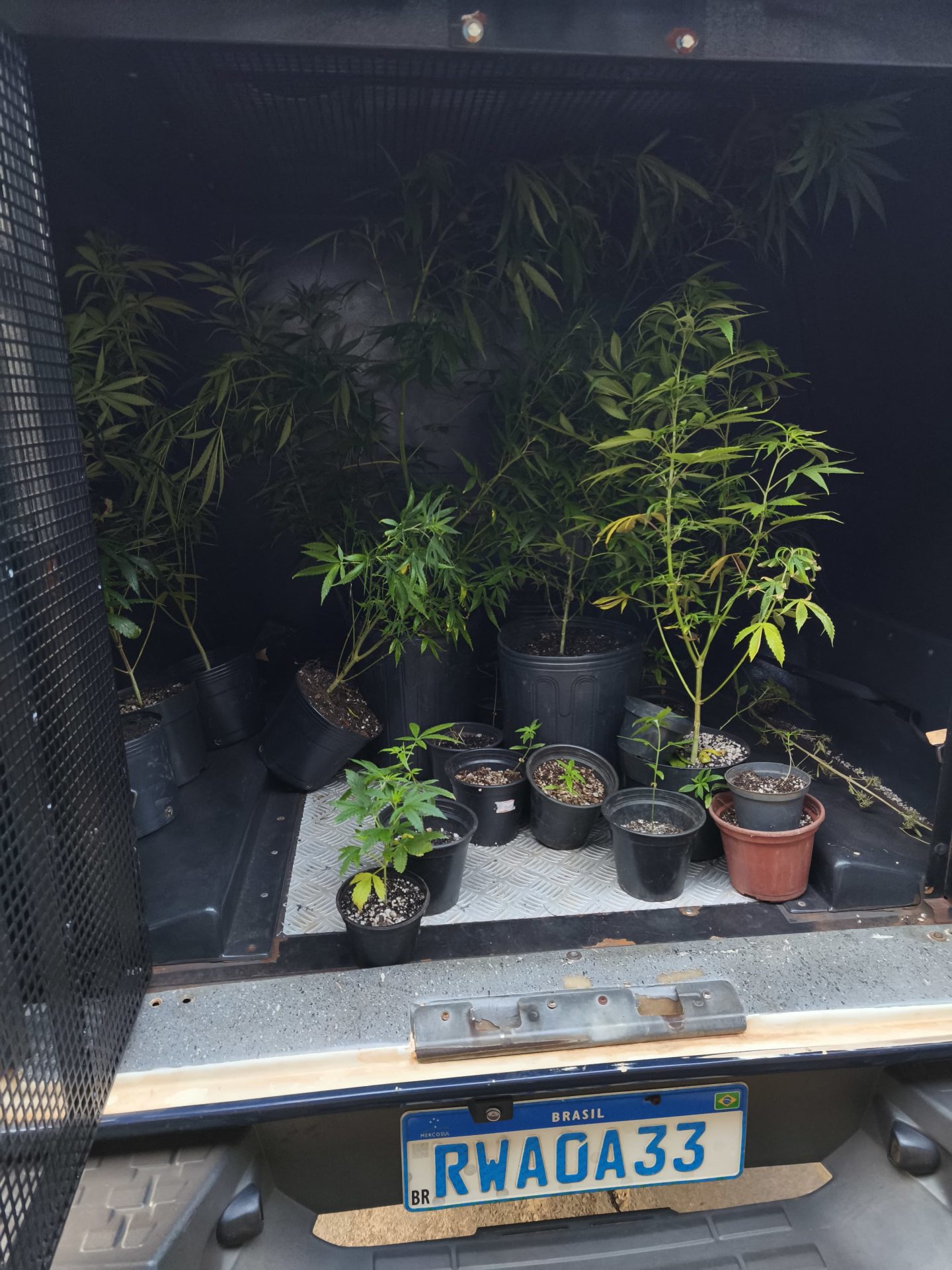 Ao chegarem ao local, os policiais visualizaram um indivíduo que, ao notar a presença da viatura, tentou se evadir para os fundos da residência, desobedecendo à ordem de parada. Durante a abordagem, nada de ilícito foi encontrado com ele. Em seguida, outro homem se apresentou como responsável pelo imóvel, momento em que a equipe policial percebeu a existência de diversos pés de plantação de substância análoga à maconha na área externa da casa.
