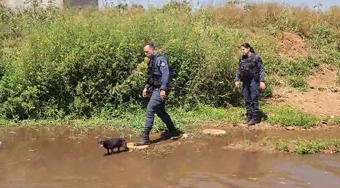 Diante da vulnerabilidade do animal, os militares adentraram o córrego e realizaram o resgate com segurança. A moradora que fez o chamado prontificou-se a acolher o cão temporariamente em sua residência, até que o tutor fosse localizado.