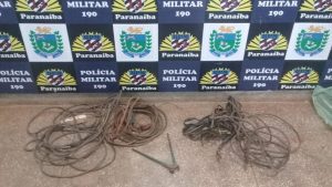 Os policiais militares, por volta das 08h40, receberam denúncia de que um indivíduo com uma faca teria arrancado cabos da bateria de um caminhão que estava de frente a uma oficina localizada na Rua Francisco Neves, no Bairro São José, e em seguida adentrado o pátio da oficina e saído do local com duas sacolas. A equipe policial conseguiu abordar o indivíduo nas proximidades do local e constatou que as sacolas continham dos cabos de bateria, 01 truquesa e uma extensão de aproximadamente 15 metros. Os policiais entram em contato com cidadão que mora na oficina, o qual relatou que a ferramenta, bem como os demais objetos eram de sua responsabilidade. Diante disso, os policiais deram voz de prisão ao indivíduo por prática de furto e o encaminharam para a delegacia de Polícia Civil para demais providências.