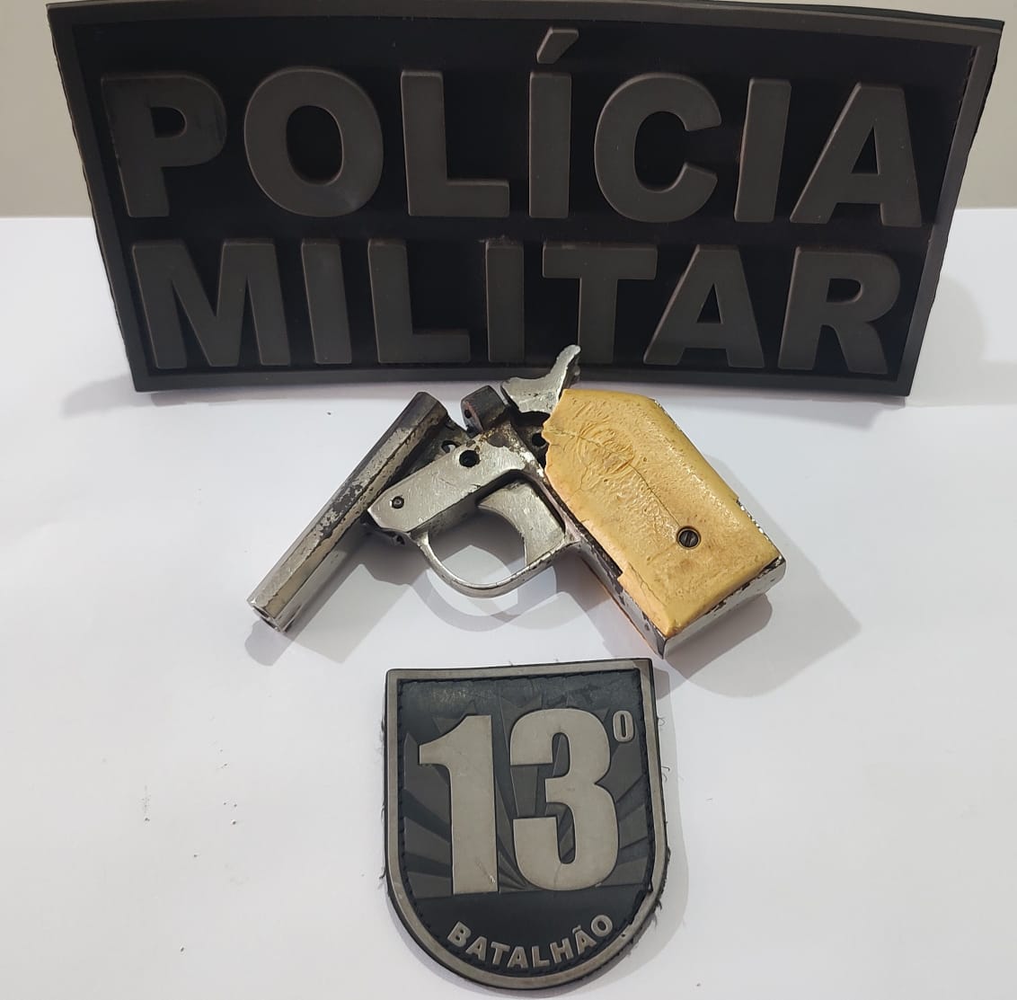 Durante a busca pessoal, os militares localizaram na cintura do suspeito uma arma de fogo do tipo garrucha, aparentemente de calibre .22, sem numeração de identificação.
