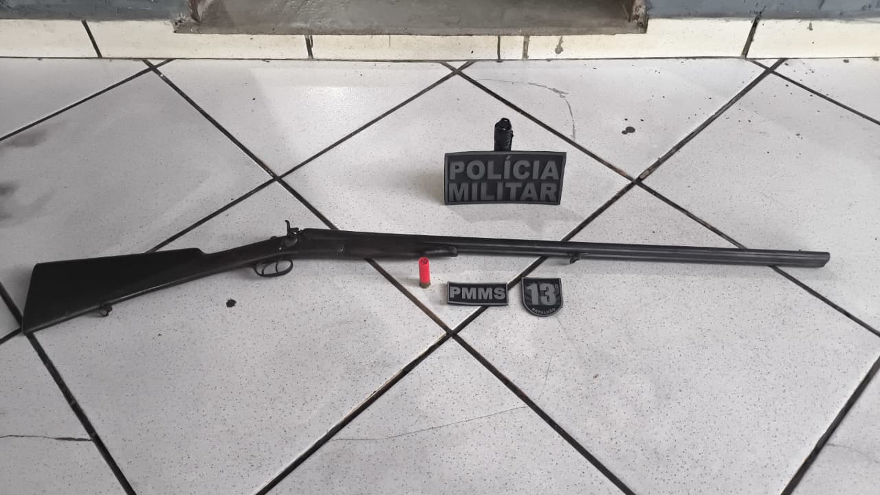 No local indicado pelo autor, os policiais localizaram a espingarda sobre um guarda-roupa, contendo uma munição carregada em seu interior. A arma e a munição foram apreendidas imediatamente.