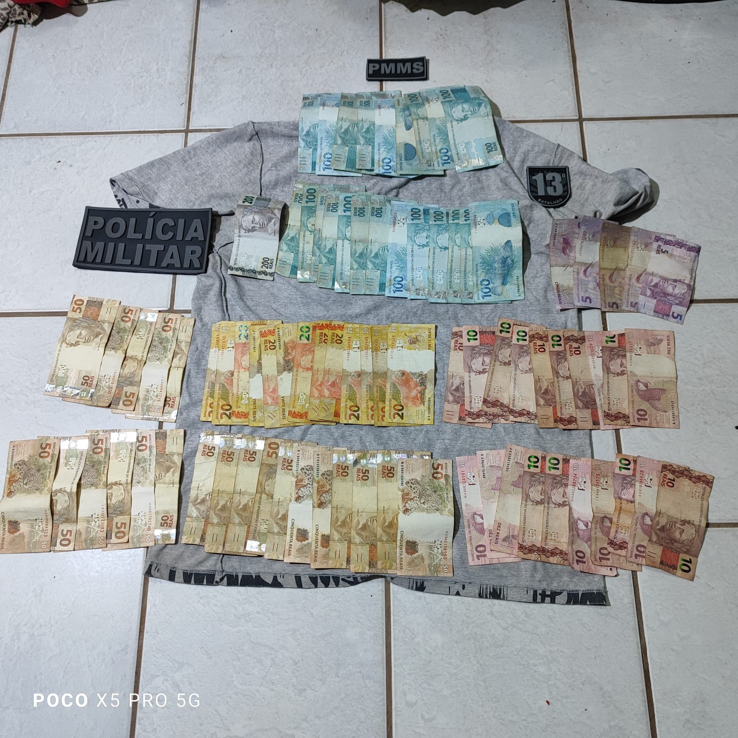 Diante das evidências, o homem recebeu voz de prisão. A Polícia Científica foi acionada e realizou a perícia técnica no local, recolhendo os objetos e o montante recuperado.