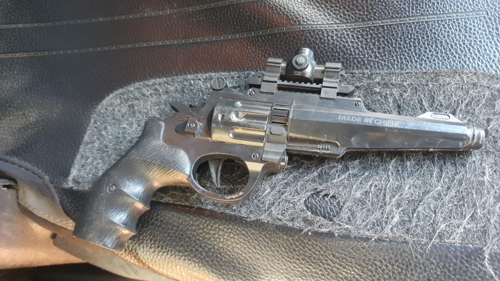 Durante a abordagem, o indivíduo jogou ao solo um simulacro de arma de fogo do tipo revólver, de cor preta. Durante a revista pessoal, foram encontrados 4 envelopes de moedas lacrados, totalizando R$ 4,00, e o valor de R$ 877,00 em cédulas, subtraídos no roubo ocorrido anteriormente. O indivíduo estava vestindo um casaco preto e um boné preto com detalhes cinzas na parte da frente. Ele informou que residia em uma área de invasão conhecida como Favela Dom Antônio, próxima ao local da abordagem. A equipe se deslocou até o endereço fornecido para verificar se havia mais produtos provenientes de roubo ou ilícitos, porém, apenas um aparelho de celular da marca Samsung, modelo SM-A032/DS, foi encontrado, sendo confirmado pelo autor como sendo de sua propriedade.