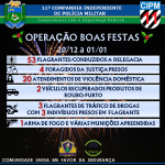As ocorrências são desdobramento da Operação Boas Festas, que aconteceu entre os dias 20 de Dezembro a 01 Janeiro em toda a área da 11ª CIPM, que compreende a Região Urbana do Segredo (norte da capital do MS), os municípios de Rochedo e Corguinho.