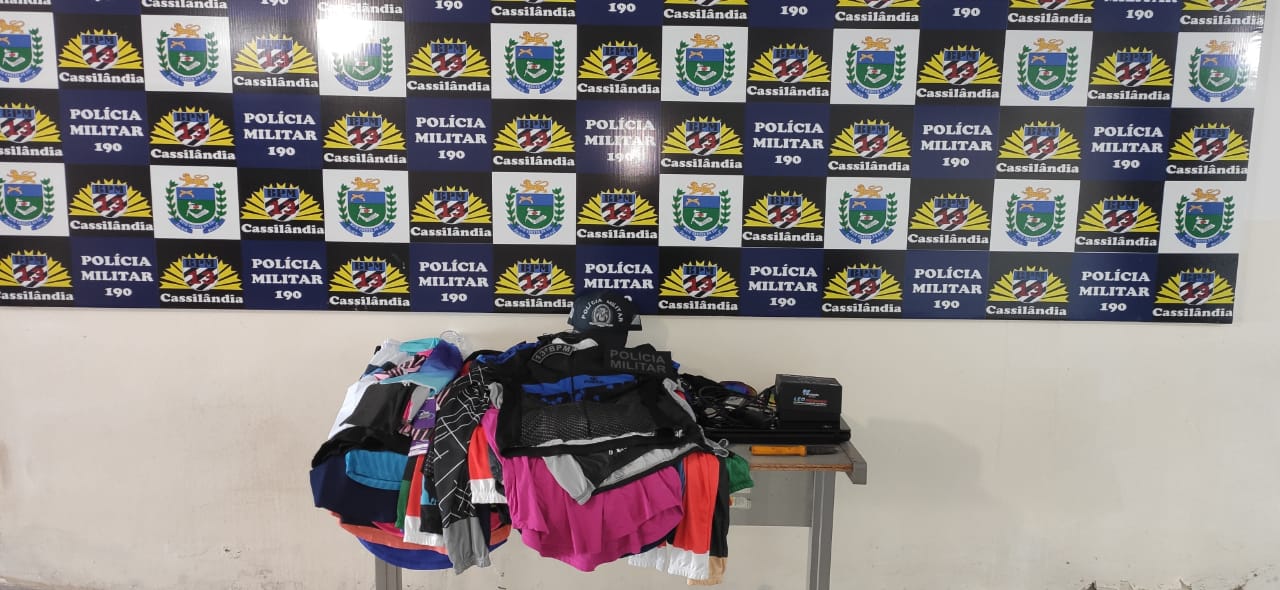 O proprietário informou que vários objetos foram levados, incluindo o notebook e várias roupas. A guarnição em diligência encontrou os dois suspeitos que estavam numa casa localizada no bairro Imperatriz, e dentro da casa foram encontraram várias roupas e o carregador do computador e da máquina s de cartão que estavam em baixo de uma caixa. O restante do material foi encontrado em um matagal do outro lado do córrego que margeia a habitação.