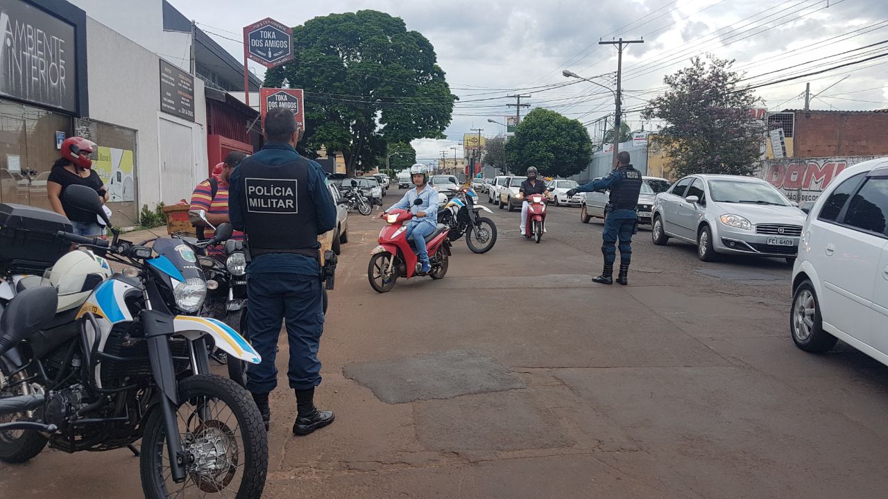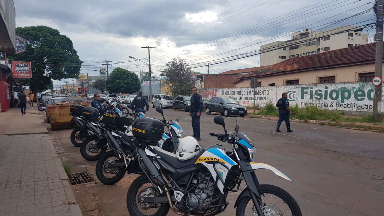 Campo Grande (MS) – Nesta sexta-feira, 19 de janeiro de 2018, o 17º Batalhão de Polícia Militar de Trânsito, realiza operações em diversos pontos da cidade. Cinco motociclistas foram empenhados no centro de Campo Grande, na rua Rui Barbosa em ação de Ponto Base (PB – ação policial de presença em que os agentes de segurança permanecem fixos em pontos estratégicos, com o objetivo de coibir ações criminosas. muito utilizada em locais considerados críticos para aumentar a sensação de segurança de quem passa por ali evidenciando que o policiamento esta presente naquele local).