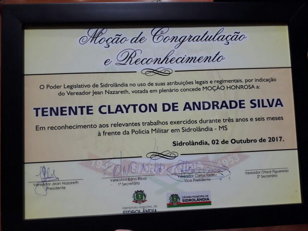 Há mais de 03 anos a frente do comando da 3ª Cia/1ºBPM , o Tenente PM Klayton de Andrade Silva que ingressou na Polícia Militar em 1998 como Sargento, formado em Administração Pública, implementou uma gestão que se destacou pelos grandes resultados alcançados. As ações de policiamento foram ampliadas conforme as necessidades da sociedade, sendo criado na gestão do Tenente PM Klayton a modalidade de Policiamento Rural que além de atender moradores da zona rural, intensificou o policiamento nos assentamentos e aldeias indígenas, diminuindo os índices criminais nas aldeias Córrego do meio e Dez de Maio e assentamentos rurais da região. Fato que levou alguns representantes das comunidades indígenas a entregar uma carta de agradecimento durante a solenidade ao Tenente PM Klayton pelo empenho em dar mais segurança aos indígenas, além de uma Moção de Agradecimento da Câmara Municipal de Sidrolândia.