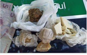 Mediante fundada suspeita, foram abordados. Um dos elementos relatou que se tratava de pedra de pasta base de cocaína e que estava fazendo o comércio da referida droga. Foram encontradas 04 porções de substância análoga a cocaína, sendo que com o segundo abordado já na rua Barão do Rio Branco, foi localizado no bolso de sua bermuda uma porção de maconha e dois celulares, além de uma certa quantia em dinheiro.