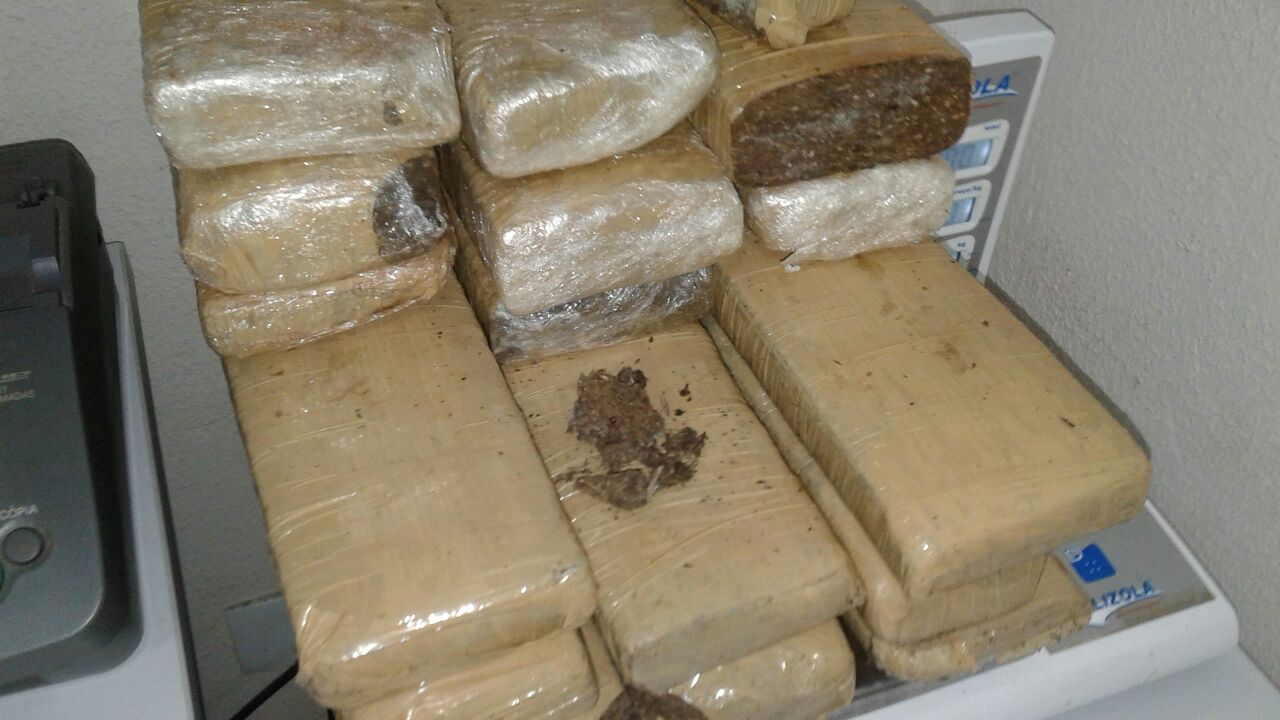 Vasculhando o matagal do terreno baldio foram encontrados 8 tabletes de maconha de aproximadamente 30cm, mais 9 tabletes de maconha de aproximadamente 15cm, mais um tablete de maconha de aproximadamente 12cm.