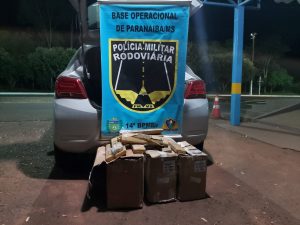 No porta-malas do veículo Chevrolet/Onix joy, com placas de Belo Horizonte-MG, foram localizados 81 tabletes de maconha que totalizaram cerca de 74 quilos.