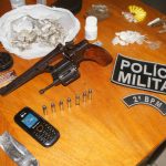 No intuito de fiscalizar menores que frequentem estabelecimentos em desacordo com Estatuto da Criança e Adolescente (ECA), foi realizada abordagem no interior de uma casa Noturna no bairro Alvorada. Durante a abordagem foi encontrado, perto de um caixa de madeira ao solo em local de acesso restrito, 01 (um) Revólver oxidado calibre 32, marca H´ PIEPCR, Btc LIGGE, com 7 munições de calibre 32 intactas. Foram encontradas ainda ao solo 10 ( quatorze) Eppendorf na cor amarela com (9,3g), 04 (quatro) Eppendorf na cor branca com (2,4g) e 26 (vinte e seis) trouxinhas com (10g) contendo substancia análoga a cocaína; 02 pequenos tabletes com (49g) , 07 (sete) cigarros com (9,6g) e 34 (trinta e quatro) trouxinhas com (98,5g) de substancia análoga a maconha, 01 (uma) trouxinha de (1g) de substancia análoga ao Crack; 01 (um) comprimido de cloridrato de sildenafila; 03 (três) comprimidos de coloração azul não identificados acondicionados em um vidro de Cystex; um celular marca LG, e um canivete.