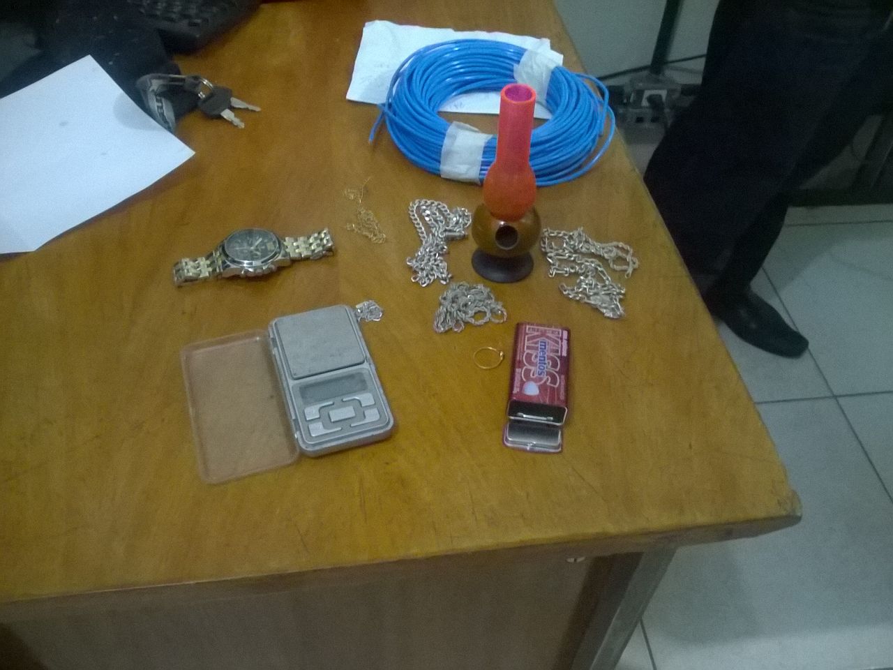 Dentro do imóvel foi encontrada a quantia de 37,1g da mesma substância além de 2,1g de outra aparentando ser crack, apetrechos para o embalo e venda de entorpecentes e a quantia de R$702,00 (Setecentos e dois Reais), 05 aparelhos celulares, 01 notebook, 09 correntes aparentando serem de prata, além de uma espingarda de pressão. Perguntado sobre a origem de todo o material o autor não soube informar a procedência.