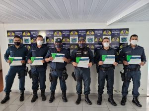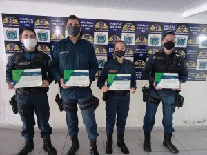Cada Policial Militar está recebendo uma Monção de Aplauso em forma de certificado juntamente com uma carta, ambos assinados pelo Presidente do Conselho Municipal de Saúde, Sr. José Roberto da Silva.