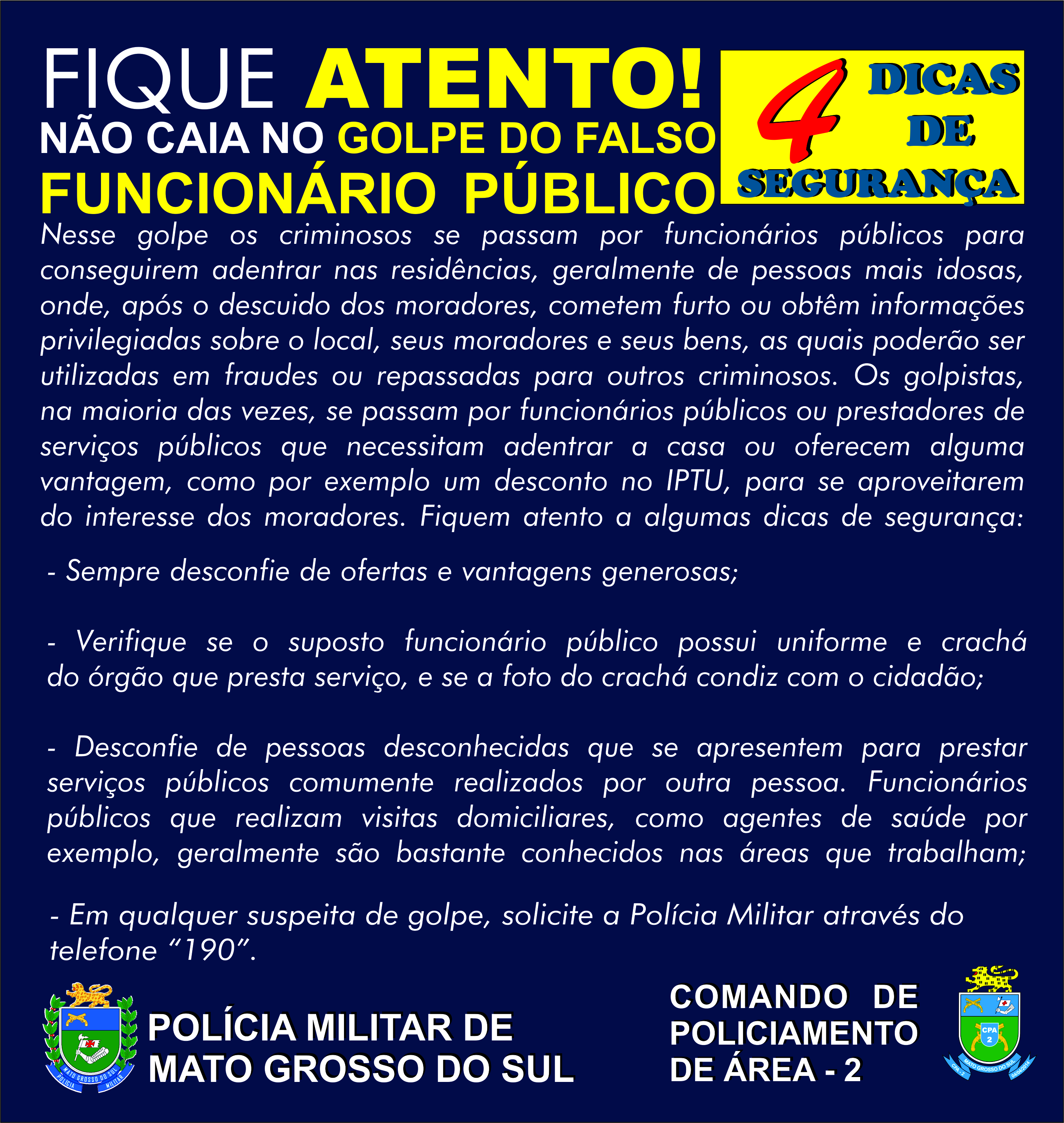 Paranaíba (MS) –  Quarta-feira (24), o Comando de Policiamento de Área 2 orienta a população sobre o Golpes do Falso Funcionário Público. Dicas de segurança foram elaboradas e buscam orientar a população sobre quais tipos de comportamentos adotar para diminuir a possibilidade caírem nesse golpe.