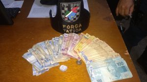 Os policiais militares patrulhavam pela Rua Quatro de Julho, no Jardim Paineiras, quando avistaram dois homens dentro de um bar, era de conhecimento dos policiais que um deles se foragido da justiça e que sobre o local existiam várias denúncias de se de ponto de venda de drogas. Ao pararem no local, os policiais visualizaram o foragido entregar algo para o indivíduo de 32 anos. Durante a abordagem, os policiais constataram com o homem de 32 anos duas trouxinhas de maconha e R$ 20 reais, o qual alegou ser usuário de drogas. O foragido possuía consigo a quantia de R$ 550 reais e durante busca pelo bar foram localizados, espalhados por vários locais, cerca de R$ 4.450 reais. Os dois homens foram presos e encaminhados, juntamente com o dinheiro e droga apreendida, à delegacia de Polícia Civil para as demais providências.