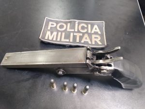 A equipe de radiopatrulha, por volta das 10h15, foi designada pela Central de Atendimento ao 190 para averiguar a denúncia de que um indivíduo estaria portando uma arma de fogo no bairro Industrial de Lourdes. Os policiais foram até a rua Uberlândia, onde realizaram abordagem a pessoa denunciada e com ela foi encontrada uma arma de fogo artesanal carregada com quatro munições calibre 38.