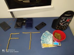 Durante a busca, os policiais encontraram 38 gramas de maconha dentro de um pote sobre o armário da cozinha, ainda localizaram 07 cigarros de maconha (11g) e a quantia de R$ 301 reais dentro de outro pote. Dando continuidade na busca domiciliar, os policiais localizaram vários telefones celulares e um deles com uma mensagem em sua tela dizendo que o aparelho teria sido roubado.