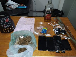 Sobre a caixa de som que utilizavam, foi encontrada uma porção de maconha (26,5g), também foi localizada uma porção de cocaína (1g). Na bolsa do adolescente de 17 anos foi encontrada duas porções de cocaína (2g), sendo informado que a droga era de propriedade de responsável pela casa e que fora entregue para que o adolescente a comercializasse.