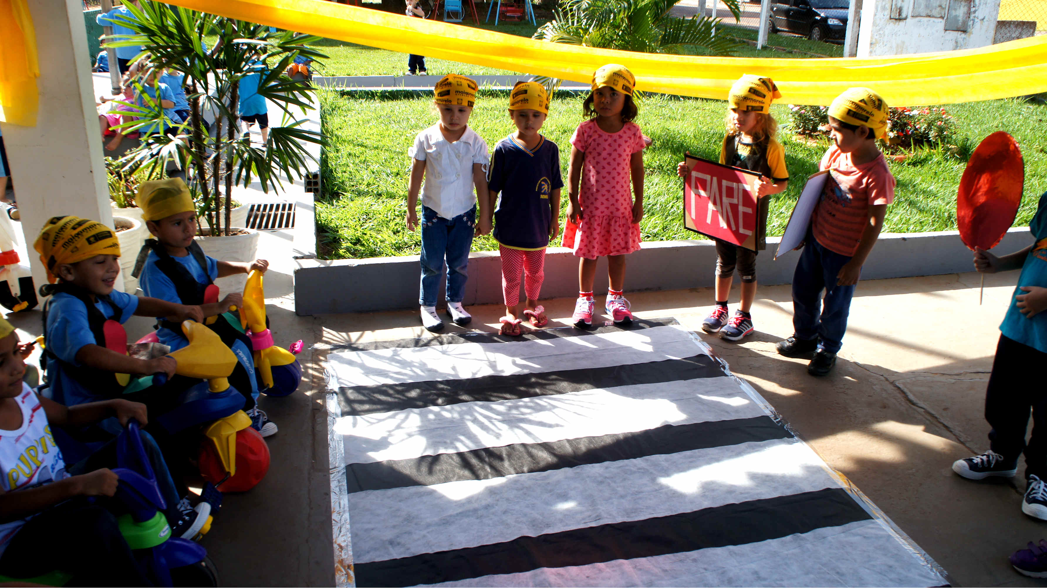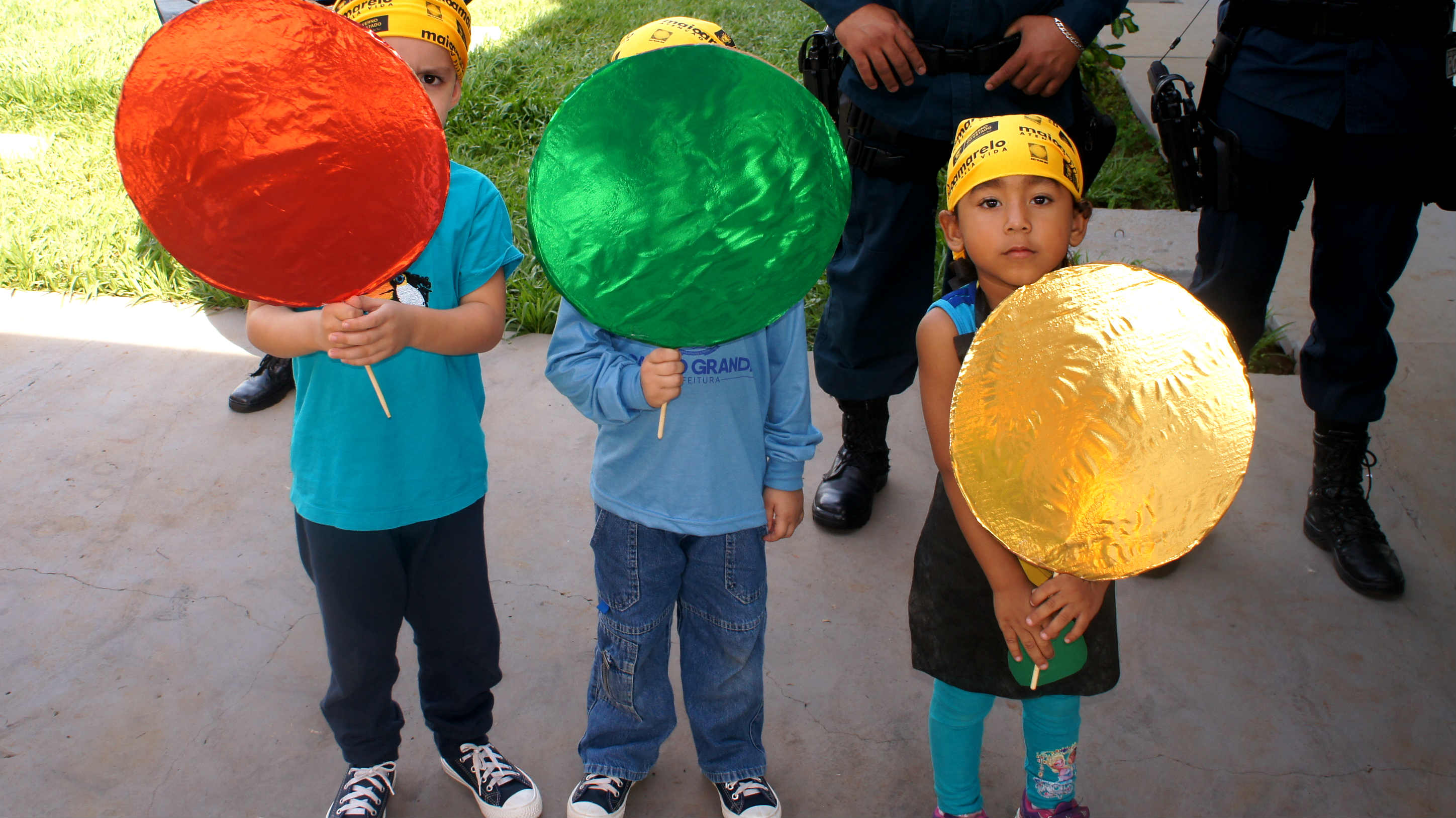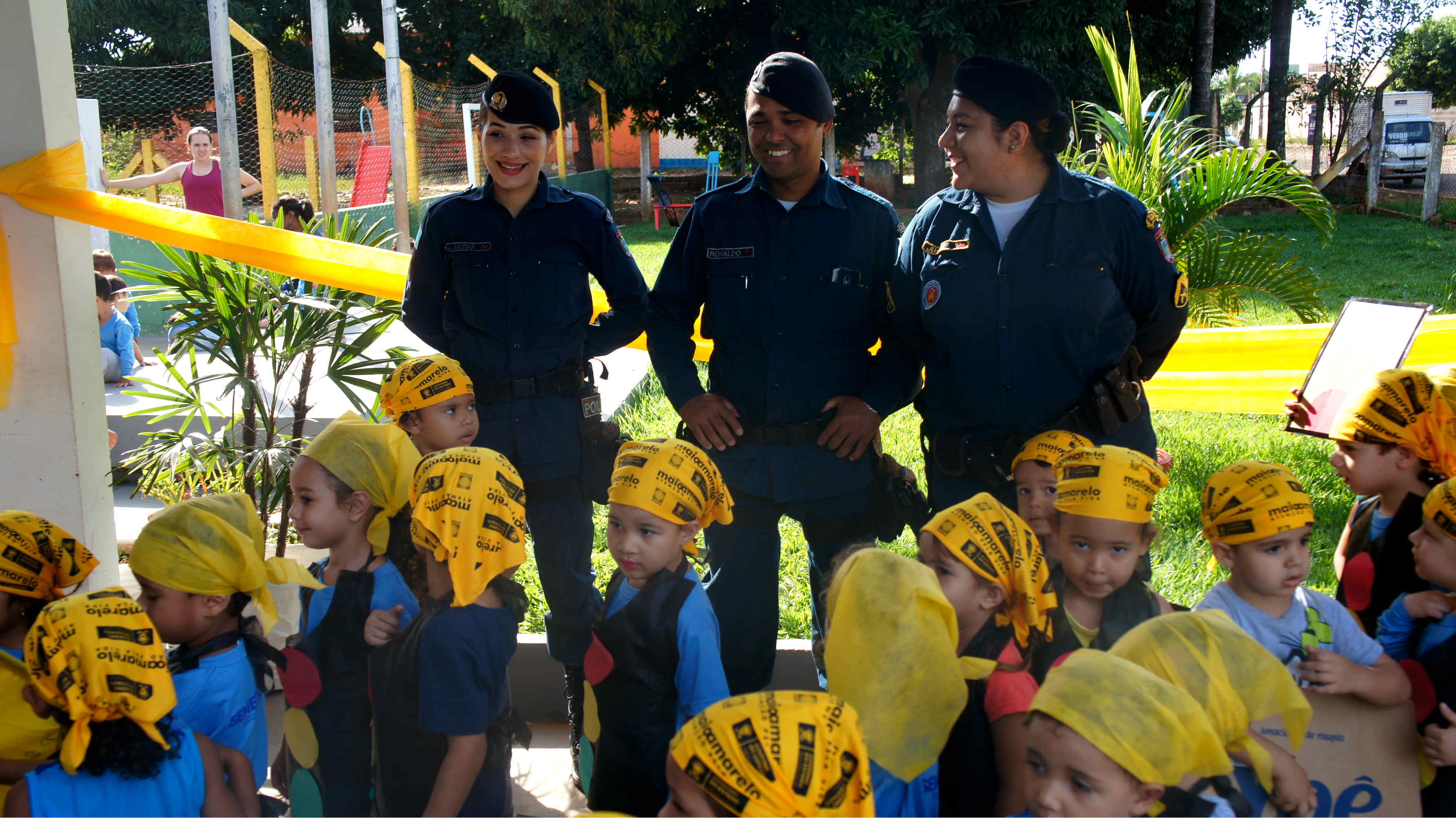Os policias da 6ª Companhia Independente de Polícia Militar, foram recebidos por cerca de 50 crianças com idades de 03 à 04 anos, das turmas creche II do CEINF Triângulo Azul, localizado no bairro Cidade Morena, para o encerramento das atividades do “Maio Amarelo”, em que as crianças receberam algumas orientações sobre a atenção e cuidados no trânsito.