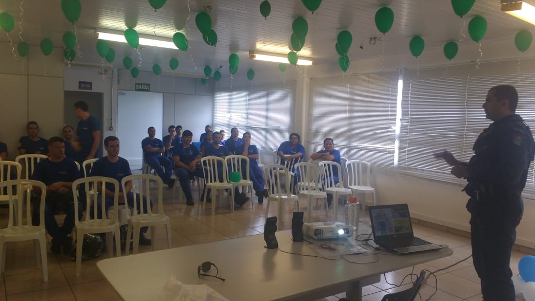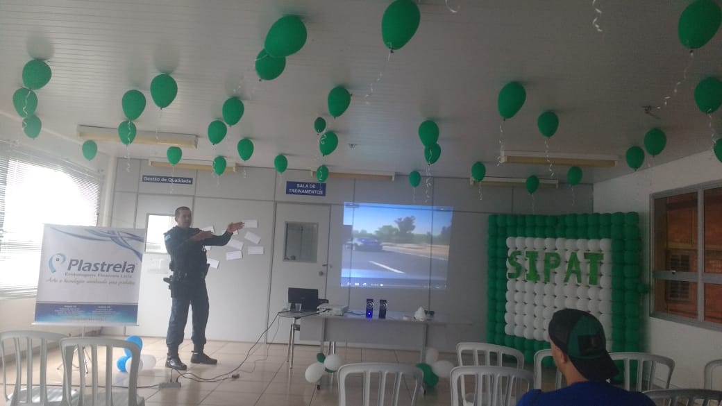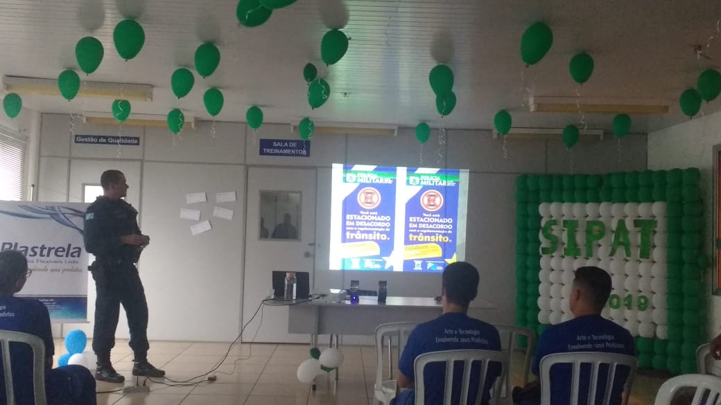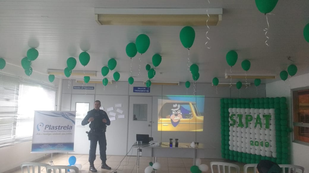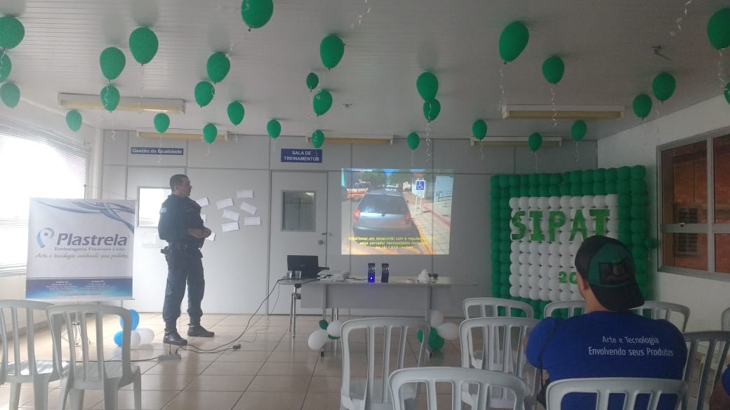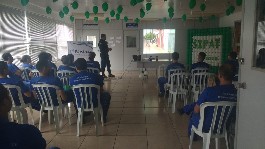 A Palestra foi ministrada pelo o Subtenente PM Luiz Carlos Pereira Vieira, subcomandante do pelotão, nas dependências da empresa Plastrela, localizada na Avenida Ajax Ramos Furquim – Distrito Industrial, e na semana passada, estava realizando palestras para os colaboradores que estavam participando da SIPAT (Semana Interna Prevenção de Acidente do Trabalho), que é uma oportunidade de melhorar o ambiente de trabalho, aumentar a atenção de cada um em relação à segurança e de diminuir a possibilidade de acidentes do trabalho.