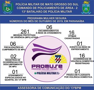 No combate a violência doméstica contra a mulher, que também é uma bandeira do comando do 13º Batalhão, o Programa Mulher Segura tem garantido a proteção das mulheres vítimas de violência doméstica, neste ano já foram realizadas 118 fiscalizações de cumprimento de medidas protetivas de urgência, em Paranaíba.