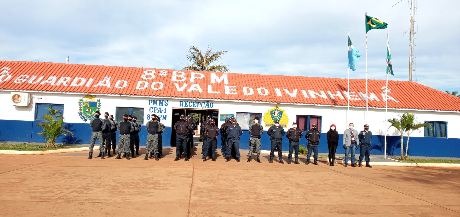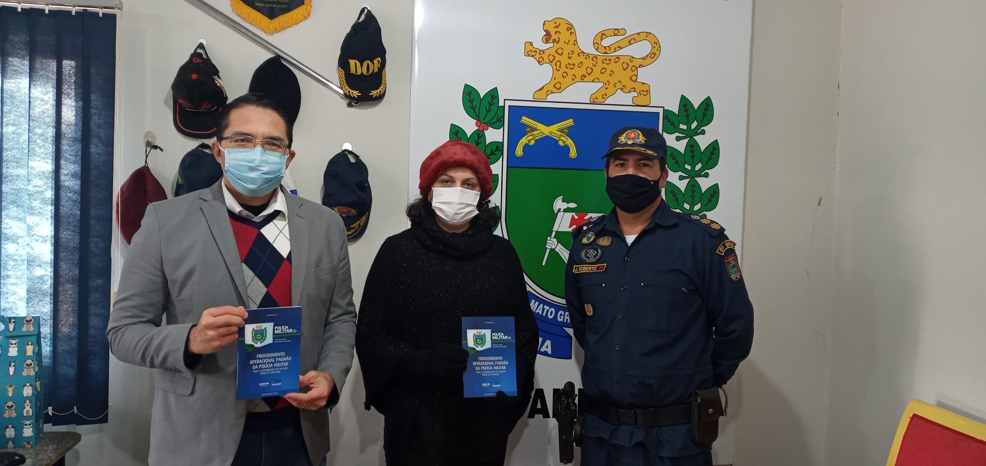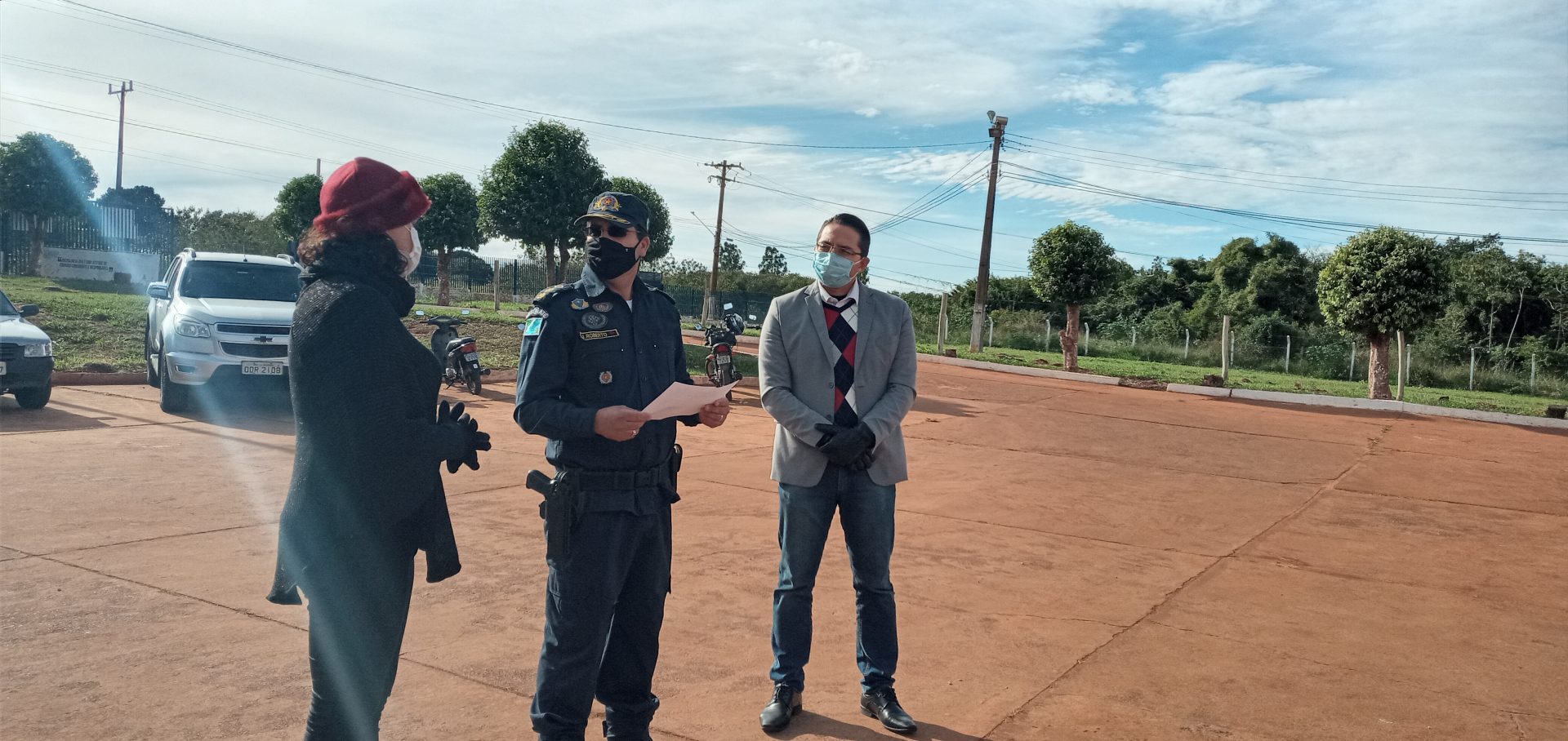 Nova Andradina (MS) – O 8º Batalhão de Polícia Militar, “Guardião do Vale do Ivinhema”, realizou hoje (29) como de costume a parada diária com o efetivo operacional e administrativo, mesmo diante da baixa temperatura em torno de 5°C apresentada nesta manhã. Os policiais militares bem como o Comandante Tenente Coronel J. Roberto foram surpreendidos no momento em que entravam em forma para o hasteamento da bandeira, pela visita da Presidente do Conselho Comunitário de Segurança de Nova Andradina Dra Etiene Cintia Chagas e o vice-presidente Dr Walter Aparecido Bernegozzi Junior, com a entrega de uma moção de parabenização pelos excelentes serviços prestados em toda a região do Vale do Ivinhema. Na oportunidade foi feita a entrega de uma cópia do POP (Procedimento Operacional Padrão da polícia Militar) de atendimento de ocorrência envolvendo violência doméstica, manual que prepara o policial militar para o atendimento nessas situações.