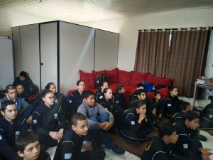 Alunos do Projeto Patrulha Mirim da Polícia Militar de Amambai assistem instrução na sede da 3ª CIPM