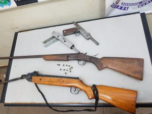 DOURADOS (MS) – Policiais Militares da 9ª Companhia Independente de Policia Militar, no inicio desta manhã, por volta de 04:00 horas da madrugada, receberam um chamado via CIOPS para atender uma ocorrência de ameaça, onde a solicitante passou a relatar que em sua granja, onde na propriedade mantem algumas residências para seus funcionários, um destes, homem de 37 (trinta e sete) anos de idade havia ido até o escritório de posse de uma arma de fogo e bastante alterado começou a dizer em voz alta: “ será que vou ter que matar um aqui”. A Equipe foi até o local onde constatou o ilícito e, na residência do autor foram encontradas quatro armas de fogo sendo, 1 (uma) artesanal inacabada, 1 (uma) artesanal funcionando, 1 (uma) espingarda de pressão alterada para cal. 22 e 1 (uma) espingarda marca rossi cal. 28. Diante dos fatos o autor foi preso e, juntamente com as armas, foi encaminhado à Polícia Civil para as providências de lei.