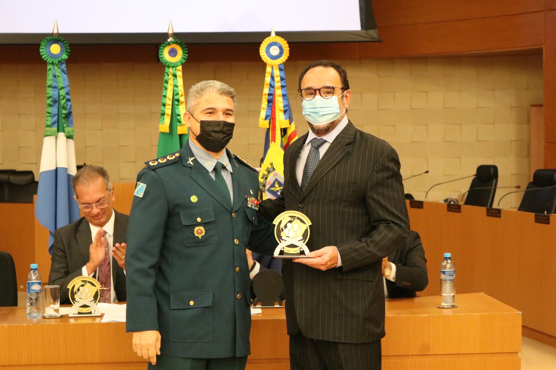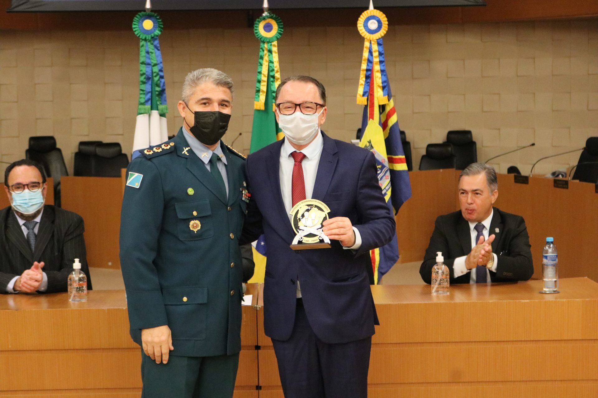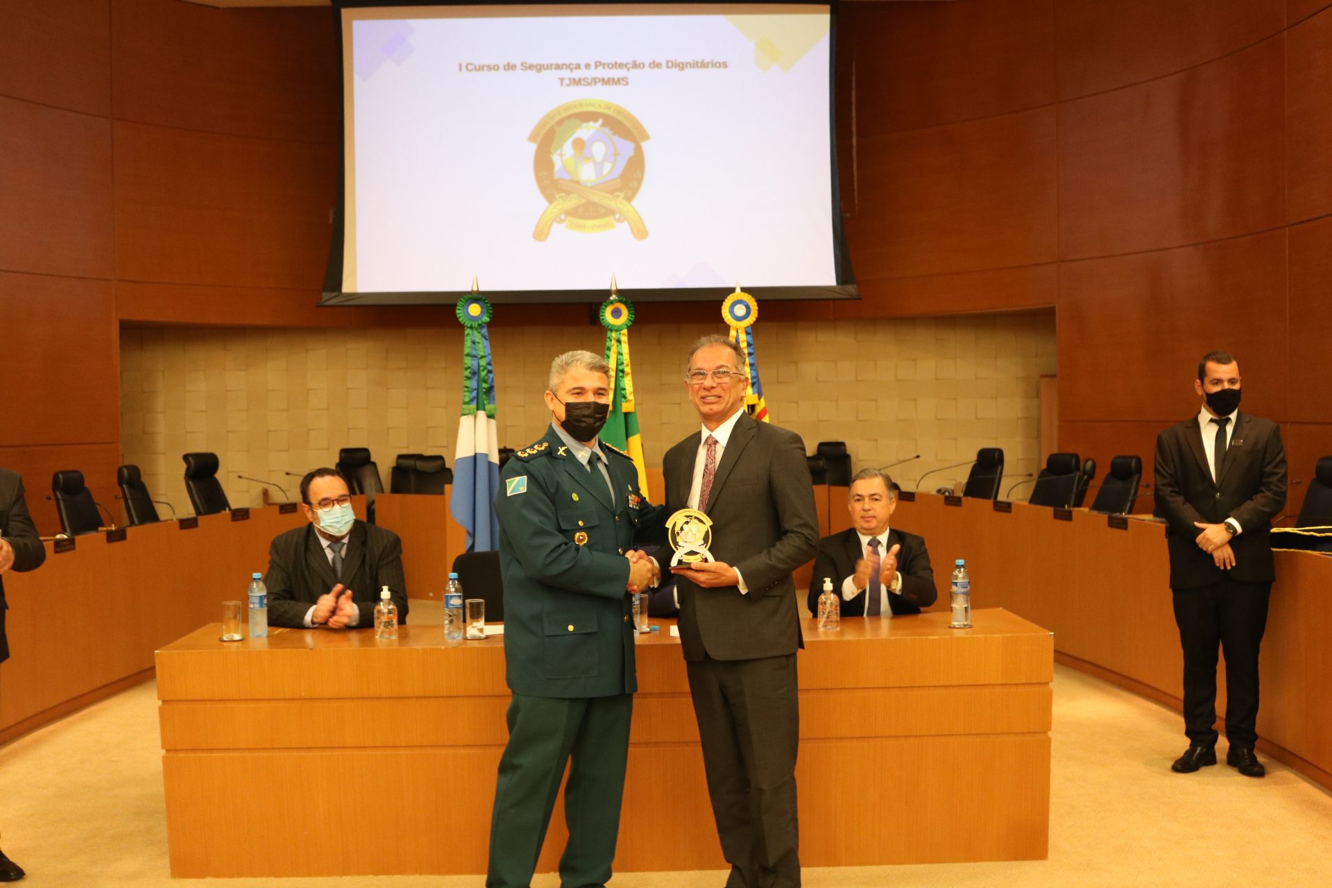 Na ocasião, o Coronel QOPM Claudio Rosa da Cruz homenageou, com o Brasão do Curso de Segurança e Proteção de Dignitários, a mesa-direta composta pelo Desembargador, Presidente do TJMS, Carlos Eduardo Contar; pelo Desembargador, Corregedor-Geral de Justiça, Luiz Tadeu Barbosa Silva; pelo Desembargador, Diretor-Geral da Ejud-TJMS, Dorival Renato Pavan e o Secretário de Estado de Justiça e Segurança Pública Antônio Carlos Videira; o Comandante-Geral da PMMS Coronel QOPM Marcos Paulo Gimenez e o Tenente-Coronel QOBM Danilo Santos Moreira Leite.