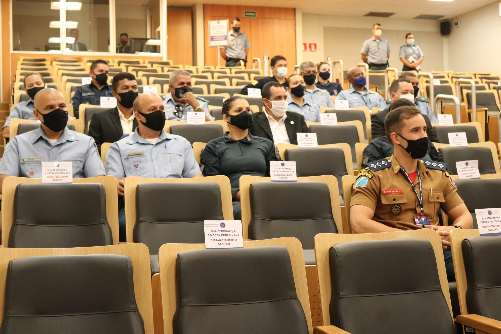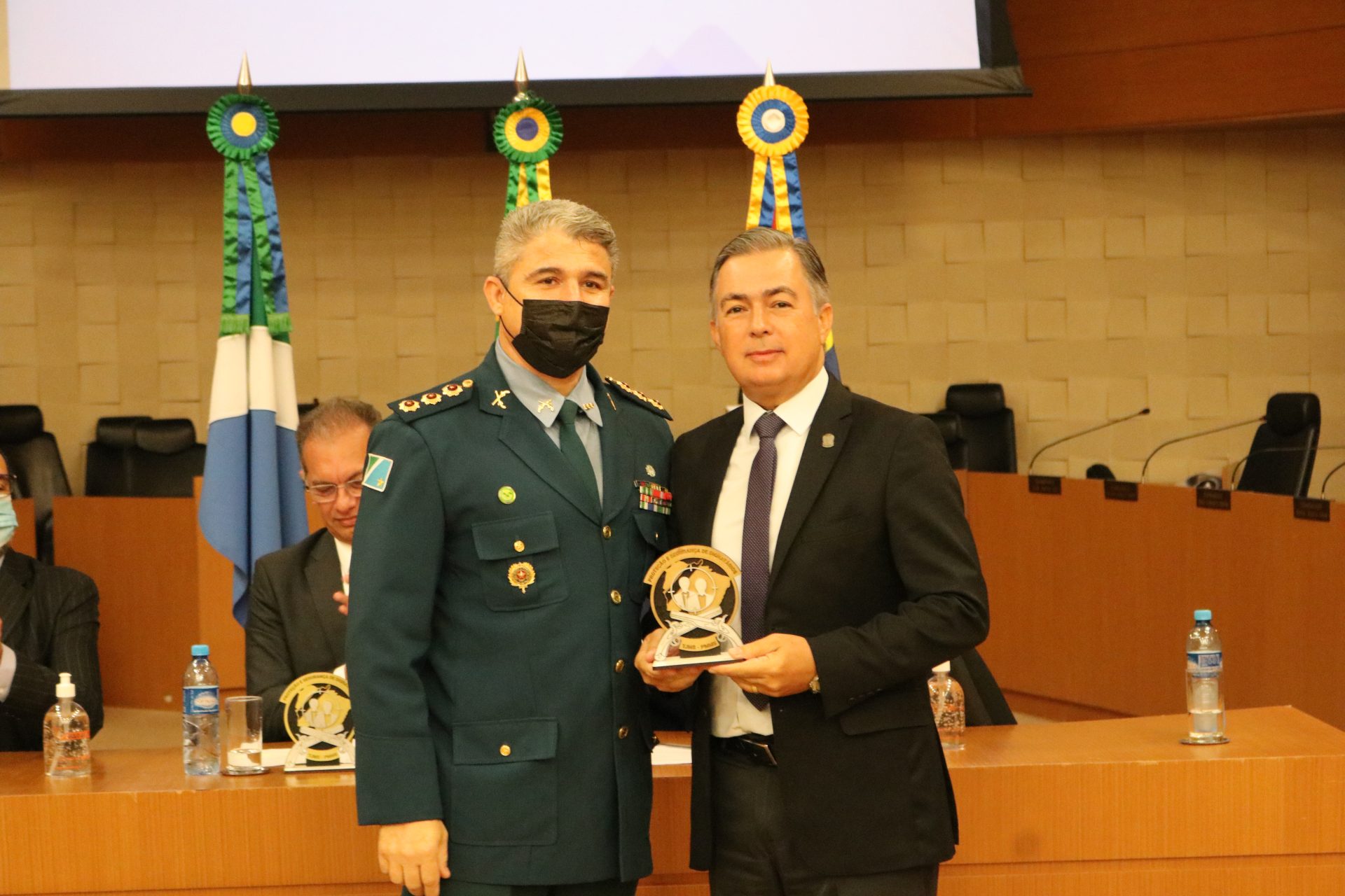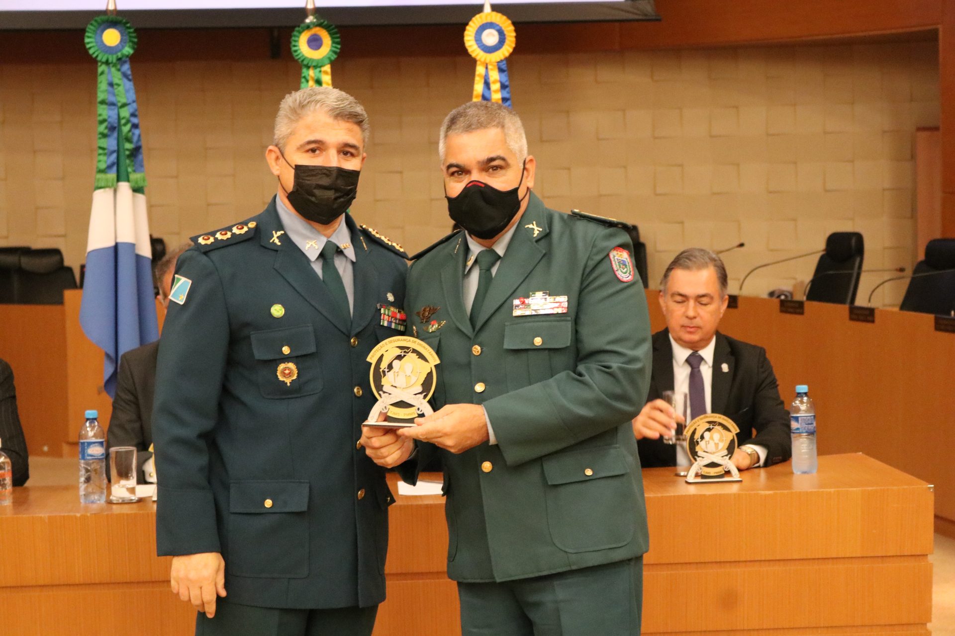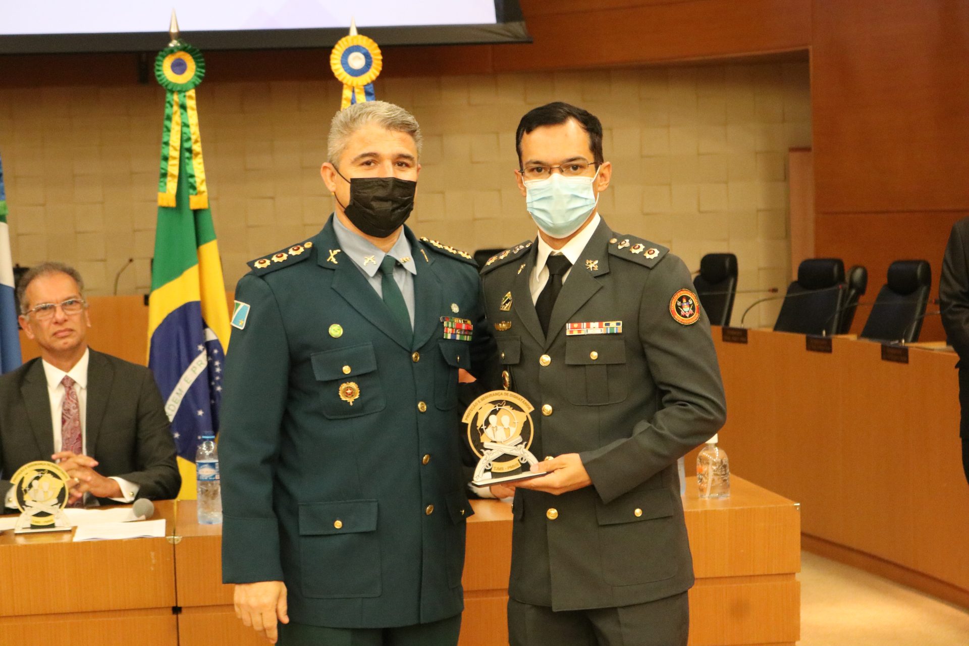 Na ocasião, o Coronel QOPM Claudio Rosa da Cruz homenageou, com o Brasão do Curso de Segurança e Proteção de Dignitários, a mesa-direta composta pelo Desembargador, Presidente do TJMS, Carlos Eduardo Contar; pelo Desembargador, Corregedor-Geral de Justiça, Luiz Tadeu Barbosa Silva; pelo Desembargador, Diretor-Geral da Ejud-TJMS, Dorival Renato Pavan e o Secretário de Estado de Justiça e Segurança Pública Antônio Carlos Videira; o Comandante-Geral da PMMS Coronel QOPM Marcos Paulo Gimenez e o Tenente-Coronel QOBM Danilo Santos Moreira Leite.