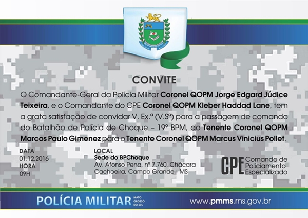 Campo Grande (MS) – 30 de novembro de 2016.  O Tenente Coronel QOPM MARCUS VINICIUS POLLET assume nesta quinta-feira 01 Dez 2016, o comando do Batalhão de Polícia de Choque – 19º BPM. A solenidade de passagem de comando acontece a partir das 09h na sede do BPChoque