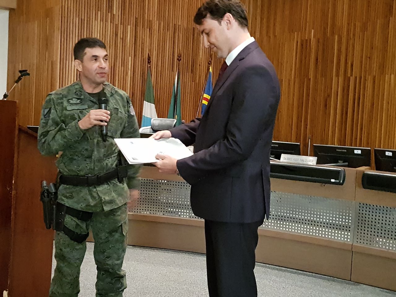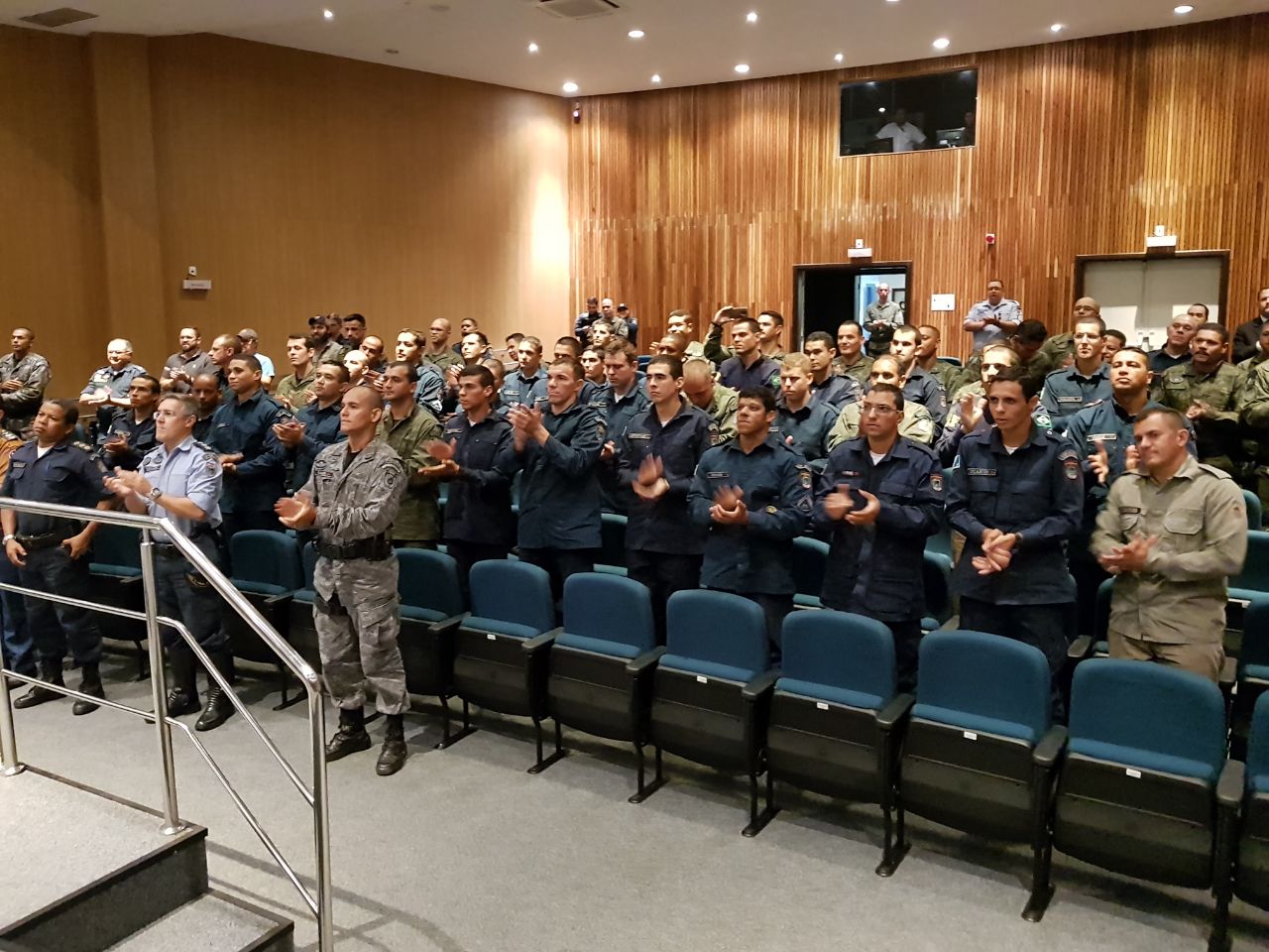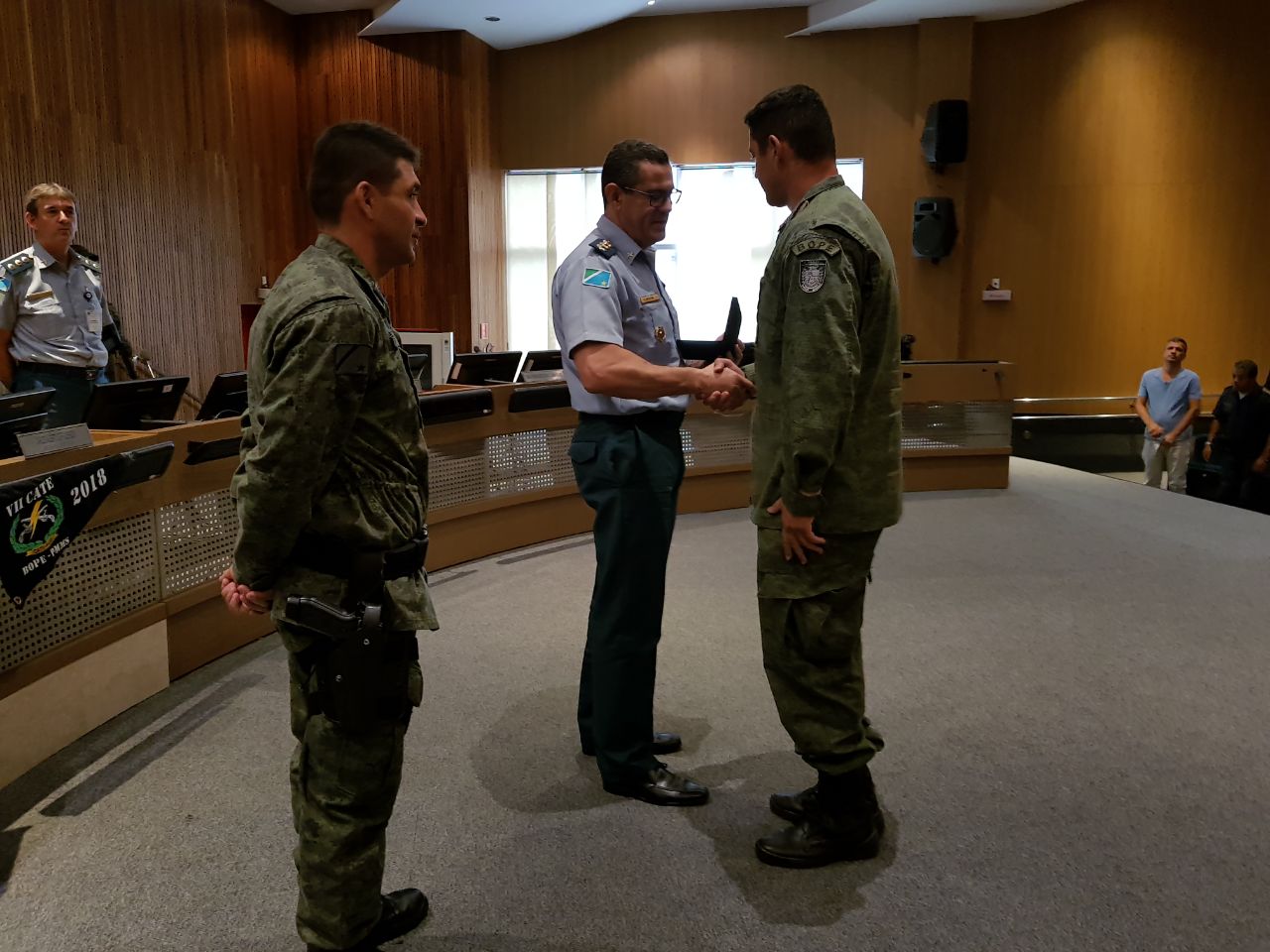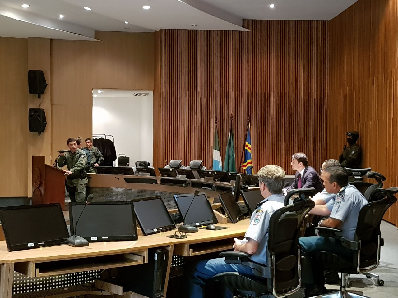 Campo Grande (MS) – O primeiro dia de aula dos alunos do VII Curso de Ações Táticas Especiais da Polícia Militar do Estado de Mato Grosso do Sul, ocorreu na tarde de hoje (28) no Plenário do Tribunal Regional do Trabalho com a presença de várias autoridades. Dentre elas o Comandante do CPE (Comando de Policiamento Especializado), Cel Voltaire, que mencionou a importância dos três momentos das Unidades de Operações Especiais (treinar, dar treinamento e operar), a importância desses momentos e como reflete nas atividades da Polícia Militar em forma de qualificação para atender a sociedade de forma plena com segurança aos policiais que estão tratando diuturnamente na atividade de policiamento ostensivo da PMMS. Discurso que coadunou com as palavras do Comandante do BOPE, Tenente-Coronel Wagner, que falou sobre o objetivo de especializar policiais para o desempenho das tarefas de execução nas mais diversas crises policiais.