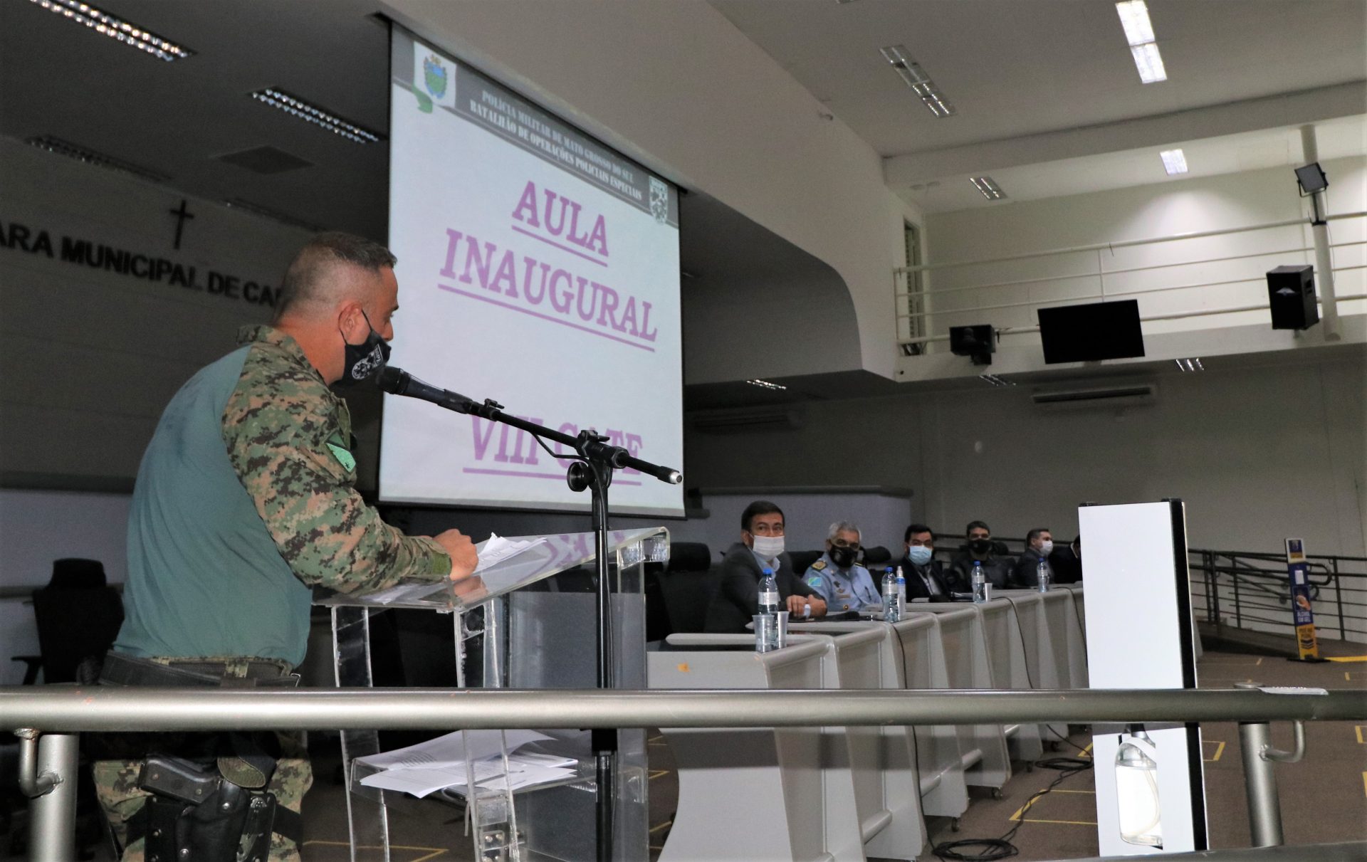 Campo Grande (MS) – A Polícia Militar do Estado de Mato Grosso do Sul por meio do Batalhão de Polícia Militar de Operações Policiais Especiais – BOPE, realizou nesta tarde (24.05) no auditório da Câmara dos Vereadores da capital do MS, a aula inaugural do VIII Curso de Ações Táticas Especiais – CATE da PMMS.