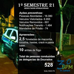 No primeiro semestre de 2021 as ações preventivas somaram mais de 16 mil abordagens a pessoas com media de quase 100 abordagens por dia, aproximadamente 7mil veículos vistoriados com o recolhimento de 10% do volume vistoriado, mais de 2,5 toneladas de drogas apreendidas na região de Dourados, apreensão de 10 armas de fogo e o encaminhamento de 528 pessoas as delegacias da cidade pelo cometimento de crime ou contravenção penal.