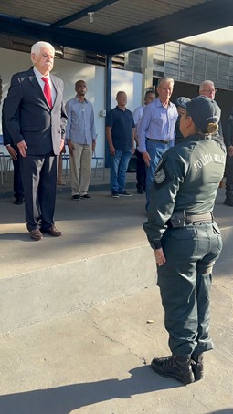 A subcomandante-geral da PMMS, Coronel Neidy Nunes Barbosa Centurião, prestou continência e agradeceu ao Coronel Carlos Cardoso de Araújo Junior que comandou o CEFAP de 13/08/1979 a 03/06/1981.