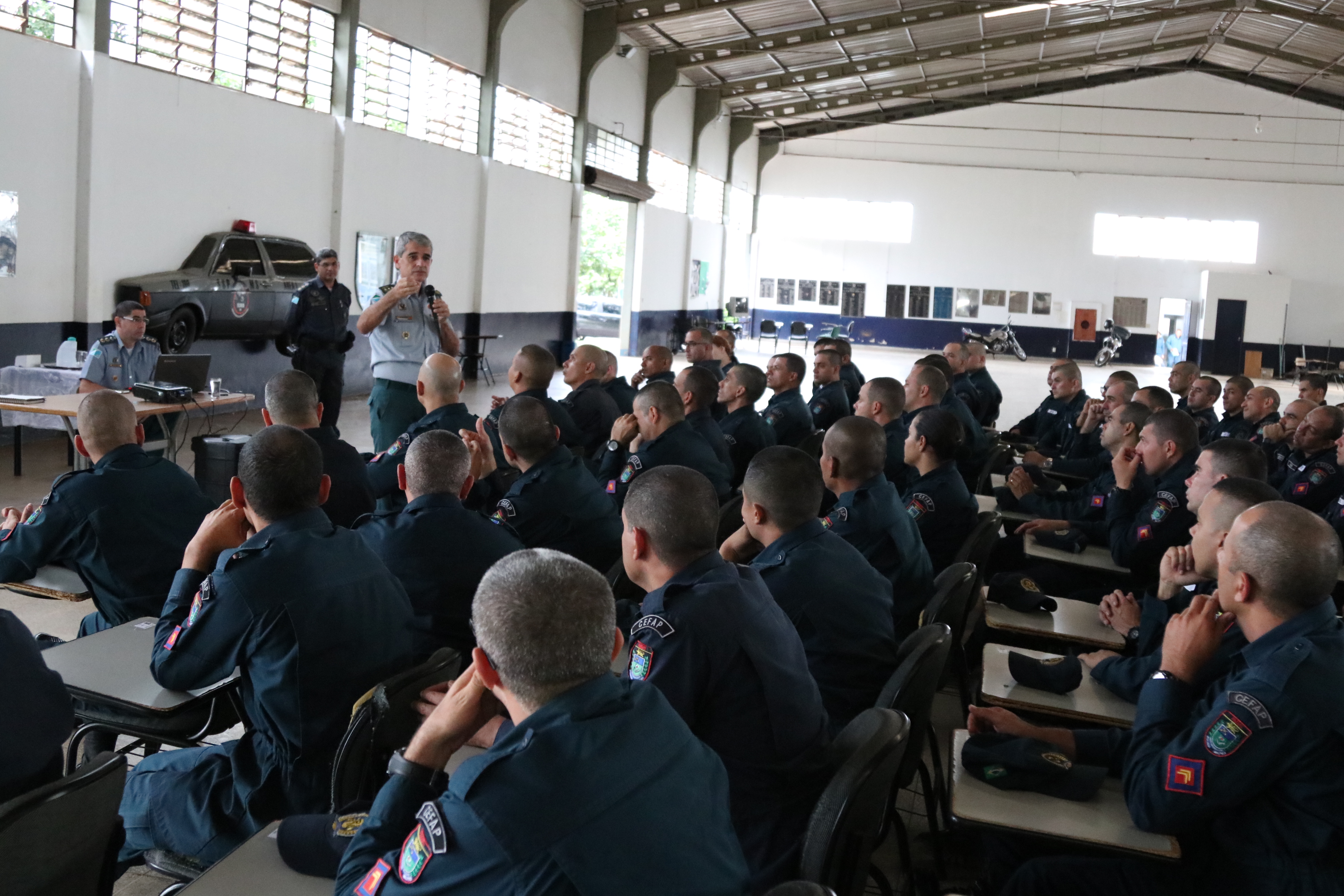 O Coronel PM Rogério que estava acompanhado do Tenente-Coronel PM Anderson Rezende Diniz, Chefe da 2ª Seção do Estado-Maior-Geral da PMMS (PM-2), apresentou aos alunos os trabalhos realizados pelas Comissões instituídas pelo Estado-Maior-Geral com a finalidade do aprimoramento técnico e humano da Corporação, dentre eles: