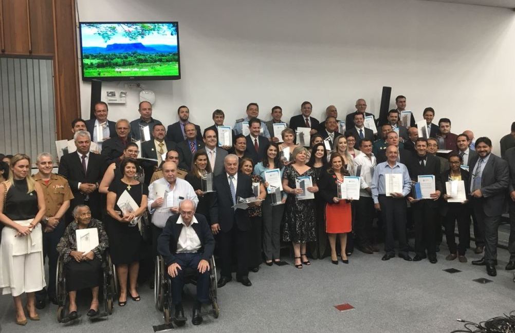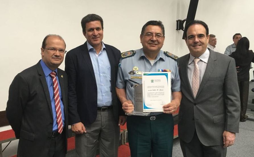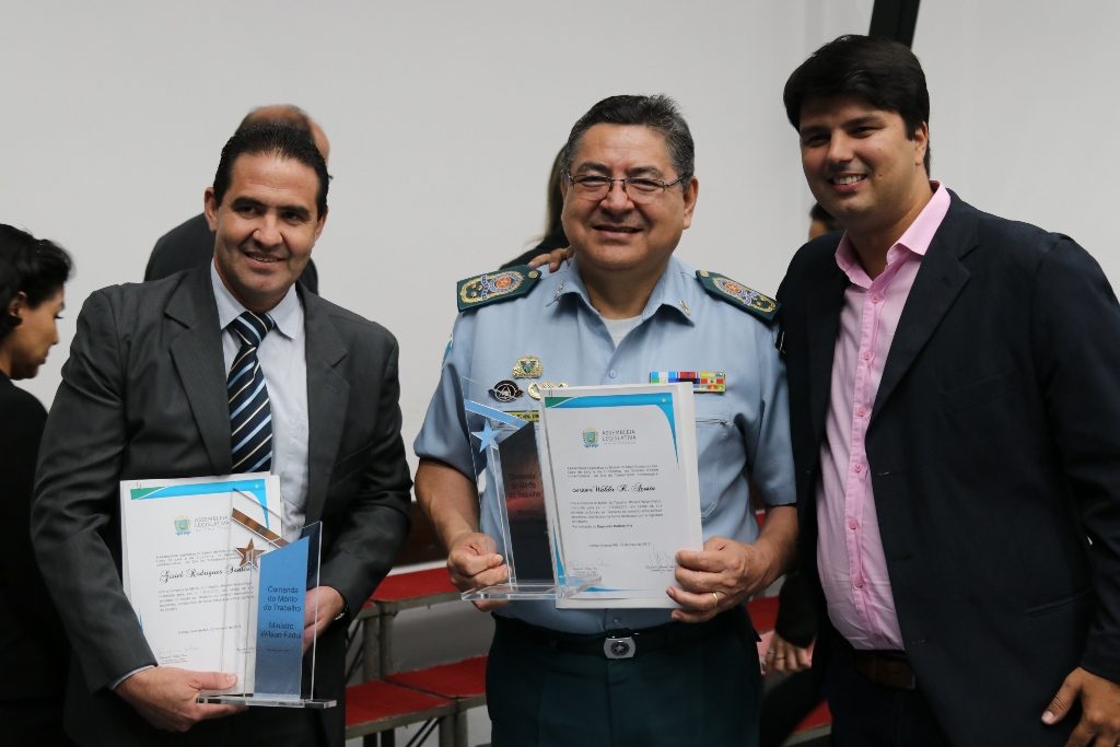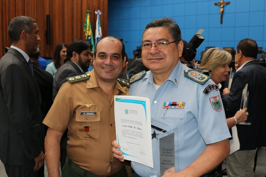 Campo Grande (MS) – O Comandante-Geral da PMMS, coronel Waldir Ribeiro Acosta e o Presidente da ABSSMS, tenente PM Thiago Mônaco Marques receberam nesta noite (02/05) a “Comenda do Mérito do Trabalho – Ministro Fadul”, no Plenário “Dep. Júlio Maia” da Assembleia Legislativa de Mato Grosso do Sul.