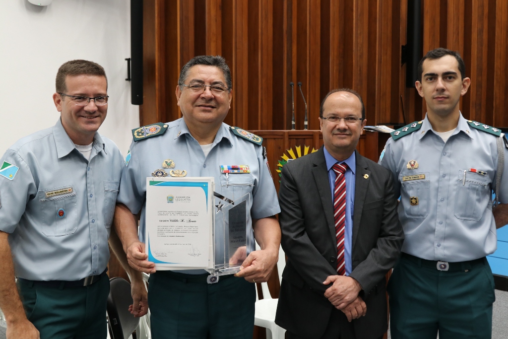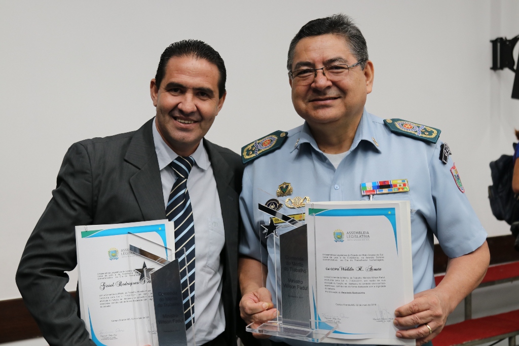 Campo Grande (MS) – O Comandante-Geral da PMMS, coronel Waldir Ribeiro Acosta e o Presidente da ABSSMS, tenente PM Thiago Mônaco Marques receberam nesta noite (02/05) a “Comenda do Mérito do Trabalho – Ministro Fadul”, no Plenário “Dep. Júlio Maia” da Assembleia Legislativa de Mato Grosso do Sul.