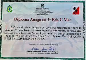 “O comando da 4ª Brigada de Cavalaria Mecanizada “Brigada Guaicurus” reconhece, por dever de justiça e de mérito, os relevantes serviços prestados a este Comando, conferindo o presente diploma e o Título de Amigo da 4ª Bda CMec ao Senhor Ten Cel QOPM HELBERT DAVYSON ROMEIRO DE SOUZA e Ten Cel QOPM RODRIGO ALEX POTRICH.”