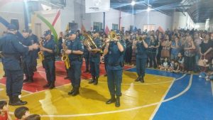 O Corpo Musical da PMMS realizou apresentação para a crianças, jovens e adultos de uma da comunidade escolar na cidade de Campo Grande. Os policiais militares fizeram a abertura dos jogos acadêmicos escolares com apresentações musicais.