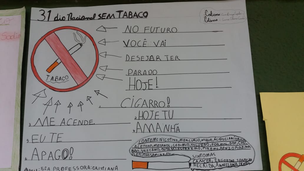 Os trabalhos foram produzidos em função do dia 31 de maio que é o Dia Mundial Sem Tabaco. Faz parte do programa do PROERD aulas que previnem essa prática informando aos alunos as consequências do uso do cigarro. De acordo com o Sargento: “Essas advertências são uma forma de estimular a prevenção ao tabagismo e também incentivar os fumantes a procurarem ajuda para se libertar desse vício que ainda faz parte da nossa sociedade e as crianças são fontes de propagação dessas informações tanto nas escolas, quanto para seus pais e amigos”.
